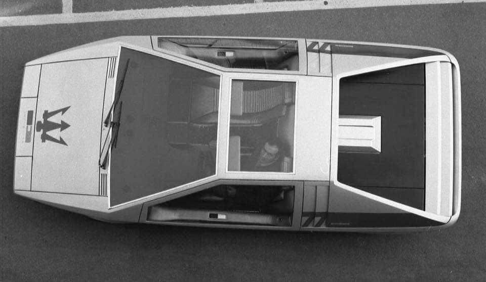 La fièvre créatrice extraordinaire de Giorgetto Giugiaro s’exprima, entre autres projets, par la Maserati Boomerang, un concept car fascinant sur base Bora, présenté initialement en orangé et sans moteur au salon de Turin 1971. Extrêmement basse (107 cm), le pare-brise extrêmement incliné (13 degrés par rapport à l’horizontale), les portières vitrées presque jusqu’en bas en deux parties (l’inférieure ouvrable), le tableau de bord au centre du volant sans jante, ce vaisseau du futur marqua fortement les esprits et servit de base à ... la Lotus Esprit !