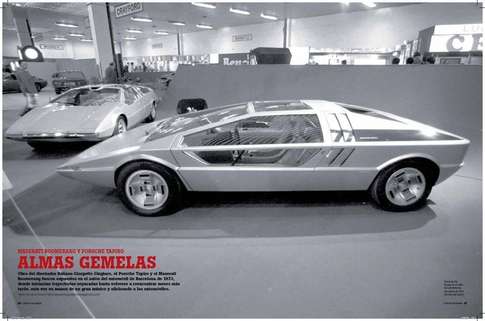 Ci-dessus, au salon de Barcelone 1973, la Maserati Boomerang est présentée à côté de la Porsche Tapiro, autre concept-car dessiné par Giugiaro. Un espagnol aisé, propriétaire de night club, va acheter en 1974 la Boomerang et la faire immatriculer, chose exceptionnelle pour un concept-car ! A l'époque, l'Espagne n'est pas encore dans l'Europe et n'applique donc pas les règles européennes : pas de crash test, même l'absence de tachymètre n'a pas empêché l'enregistrement de l'auto ! La Boomerang, utilisée comme une voiture normale dans sa période espagnole, a un peu souffert mais les portières vitrées ont ravi les enfants !