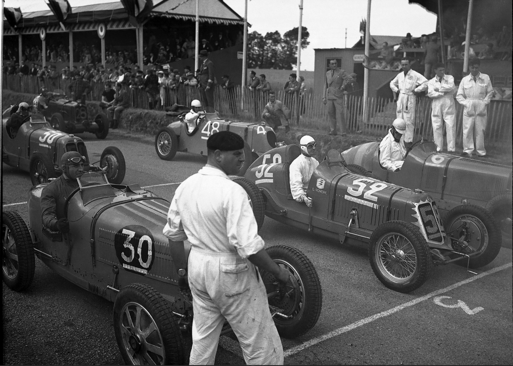 GP de Dieppe 1935. Au départ #30 Pierre Veyron Bugatti T51A #52 Gino Rovere Maserati 4CM s/n 1120 et en deuxième ligne #50 Ippolito Berrone Maserati 4CM