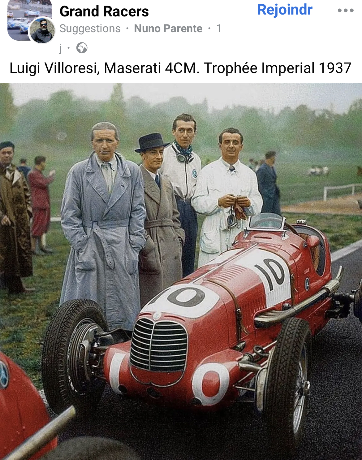 Sur la photo ci-dessous nous sommes en 1937 à Crystal Palace. Nous avons quatre personnalités du Maseratisme autour de celle 4CM. De la gauche à la droite, le comte Carlo Felice Trossi, Gino Rovere , le comte Giovanni Lurani et Luigi Villoresi :