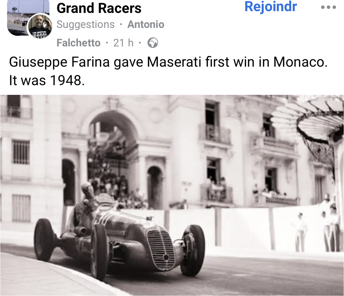 Aujourd’hui c’est le Grand Prix de Monaco. Eh bien après Farina en 1948 sur 4CL, Moss en 1956 et Fangio en 1957, tous les deux sur 250F, porteront Maserati sur la plus haute marche du podium monégasque.