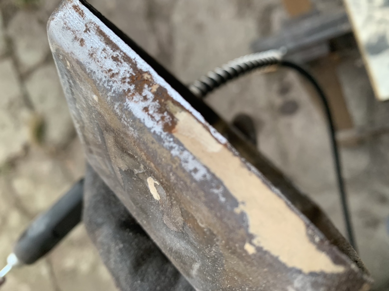 Alors bain d acétone pour enlever la peinture . Ne pas croire qu il n y a pas d oxydation dessous Je l ai baigné à l antirouille
