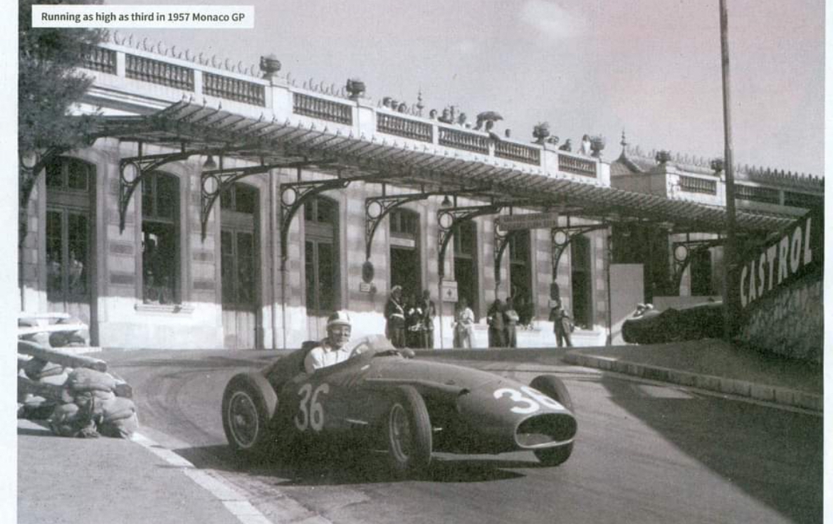 Le pilote argentin Carlos Menditeguy sur 250F au Grand Prix de Monaco 1957 au virage de la gare qui, une fois la gare déplacée, deviendra le virage de l’hôtel Loews er actuellement de l’hôtel Fairmont.