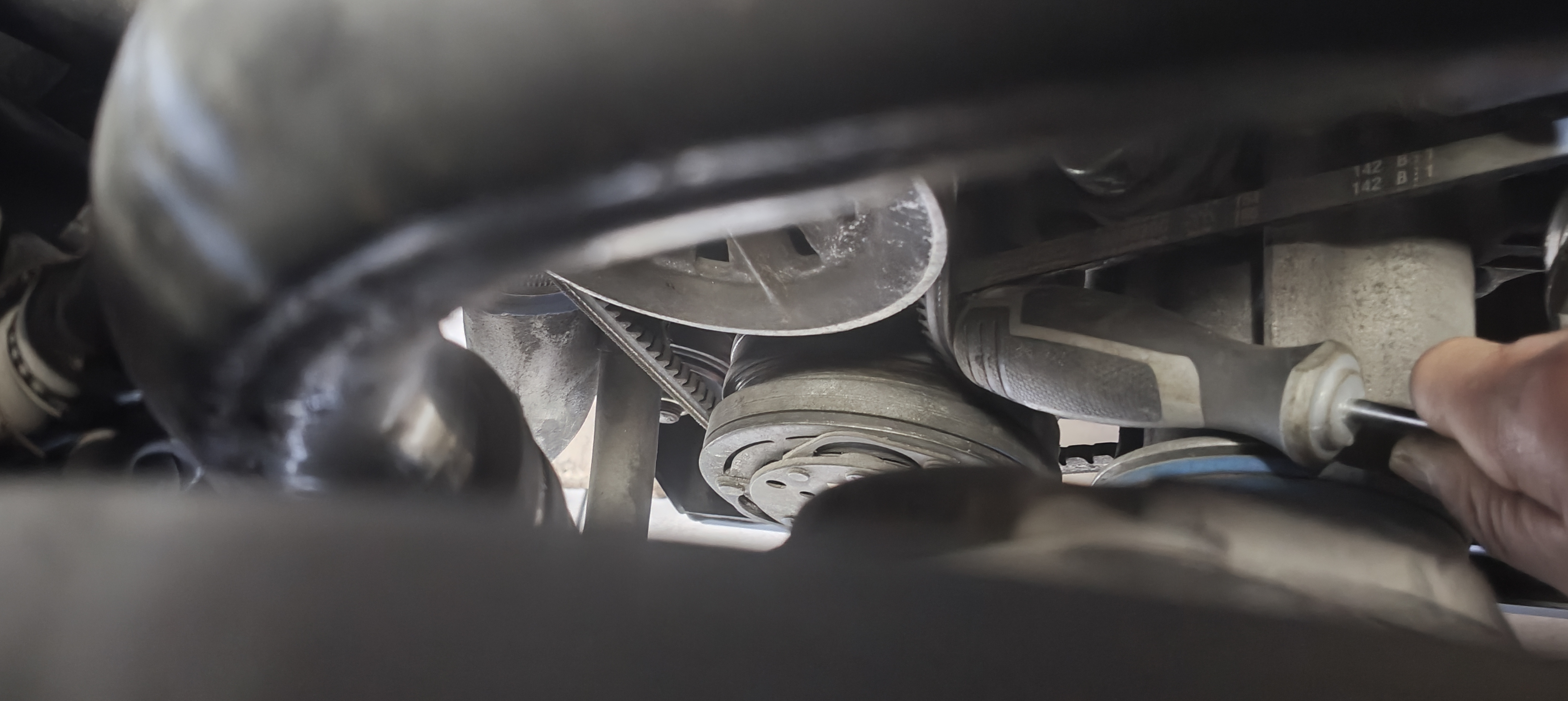 De prime abord, je ne vois pas vraiment comment tendre la courroie, il y a bien un écrou à l'arrière de la pompe (qui doit permettre la rotation j'imagine) mais il semble inaccessible. Si vous avez la technique... Ca a l'air bien pénible.