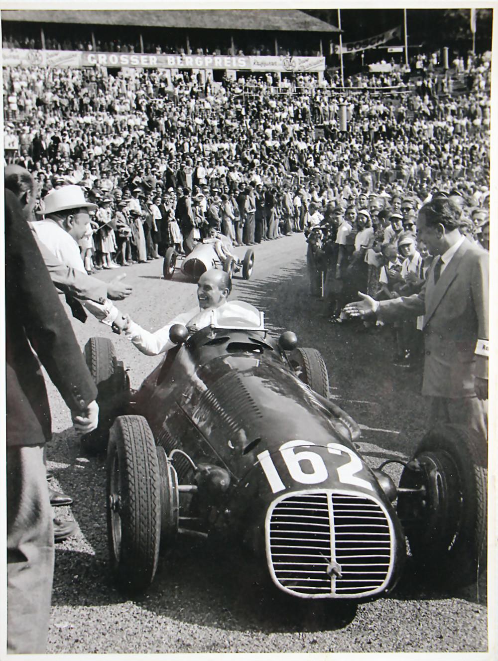 Qu’à cela ne tienne, la 8CM bénéficia de l’hospitalité de l’usine Belge Minerva où Tazio lui-même et son mécanicien personnel Decimo Compagnoni soudèrent des plaques d’acier fermant le châssis en avant. Le "mantouan volant" (Tazio) se fit une idée de l’amélioration sur route ouverte dans le trajet entre l’usine et le circuit mais il arriva trop tard pour participer aux essais qualificatifs du matin. Il dut prendre le départ en toute fin de grille. Avant le début de la course, Tazio fit passer par Compagnoni un mot griffonné à l’intention d’Achille Varzi (Bugatti) et Louis Chiron (Alfa Romeo) qui occupaient la première ligne : « vous pouvez vous écarter, je vais vous doubler ». Les deux champions sourirent d’abord, mais rirent jaune quand Tazio prit la tête de la course à la fin du premier tour pour ne plus la quitter et remporter haut la main le Grand Prix de Belgique en 4 heures et 9 minutes de course pour 595 km ! Ci-dessous Tazio Nuvolari vainqueur à SPA 1933 :