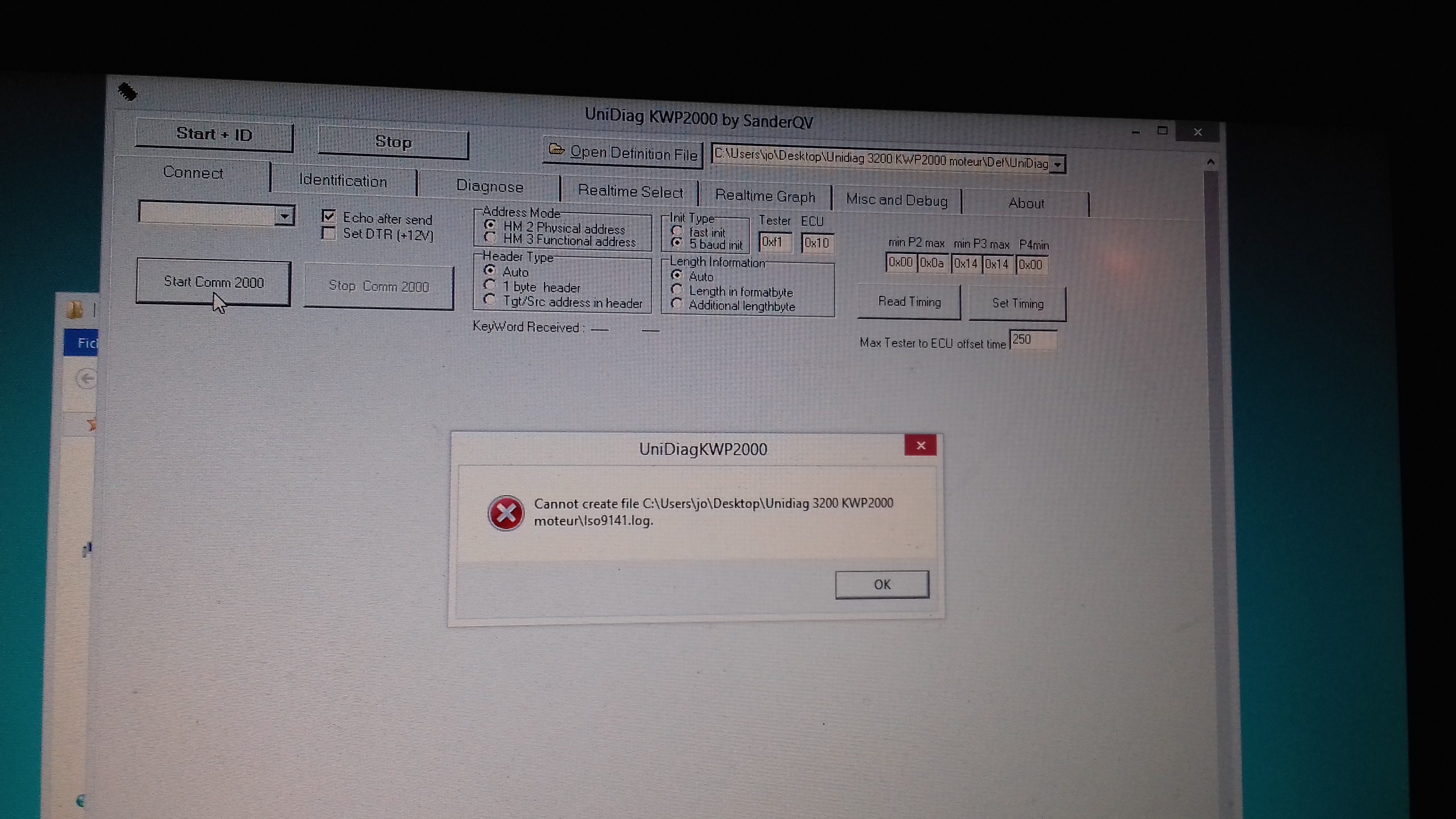 donc après avoir télécharger le logiciel KWP2000 et reçu le câble USB/OBD, je branche tout ça et dans un premier temps, il me donne ça comme erreur: