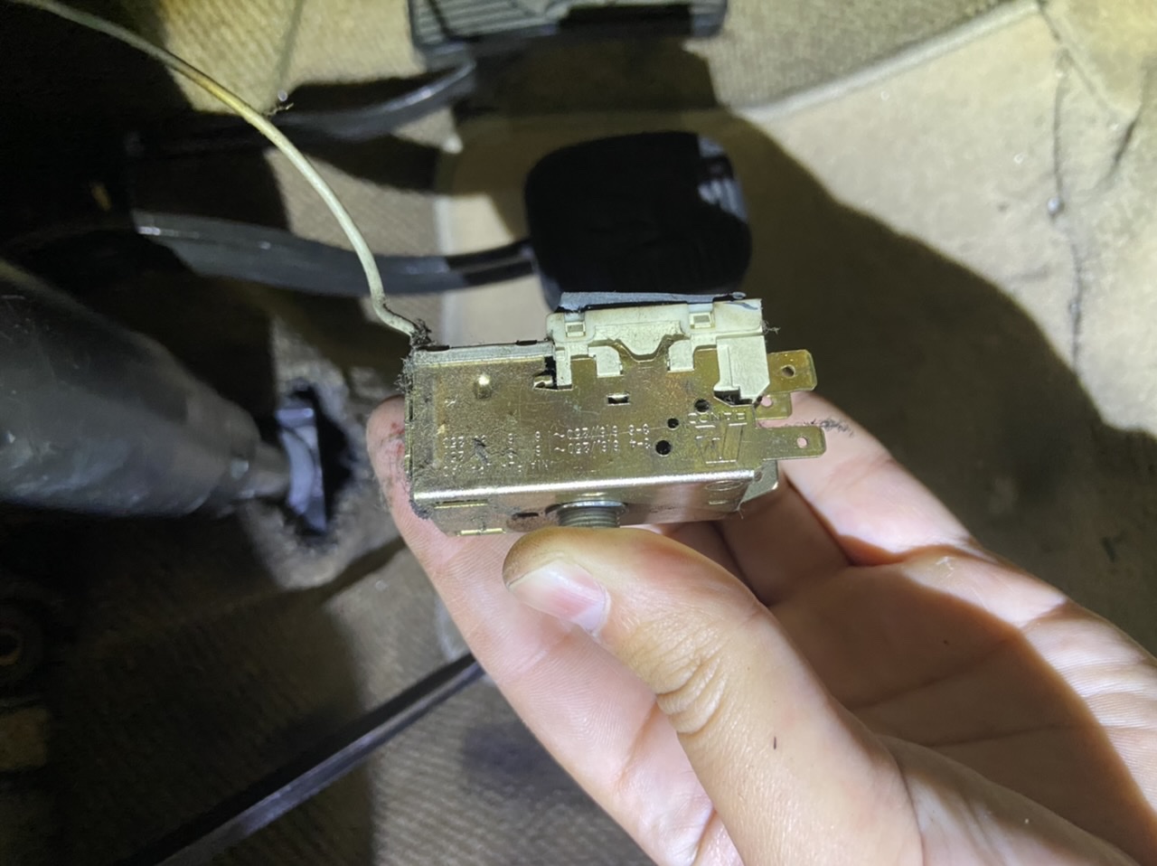 Donc, ce truc, c'est une sonde de température dont le rôle est de couper l'alimentation du compresseur si de la glace se forme sur le radiateur de clim (pas besoin de faire tourner la clim si tu as déjà un gros bloc de glace qui traine).