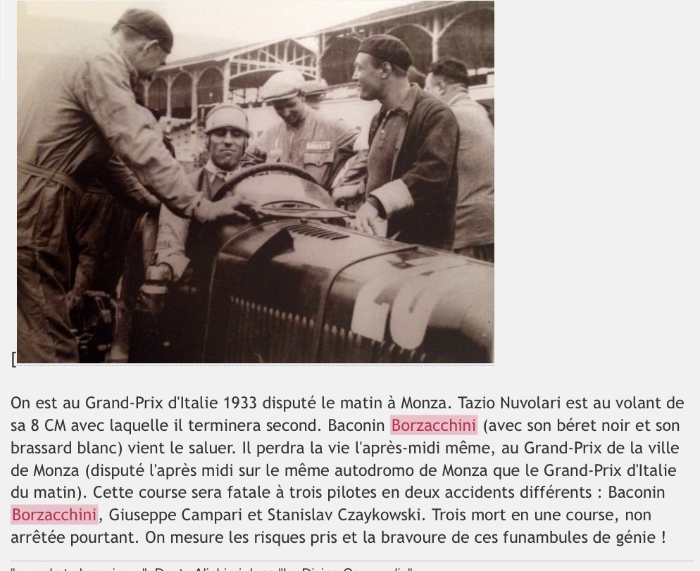 J'ai lu que l'accident de Campari et Borzacchini à Monza avait été provoqué par un dépôt de 22 litres d'huile perdus par un autre concurrent lors des courses précédentes. Aujourd'hui, cela parait complètement fou de s'imaginer qu'une course auto puisse être lancée avec un risque pareil sur la piste.