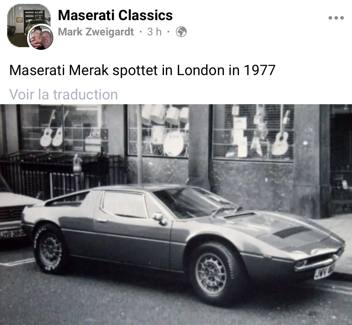 Un instrument de musique garé devant un magasin d’instruments de musique ! J’adore le son très « voiture de course » du moteur de la Merak, son plus en adéquation dans la Merak que dans la SM.