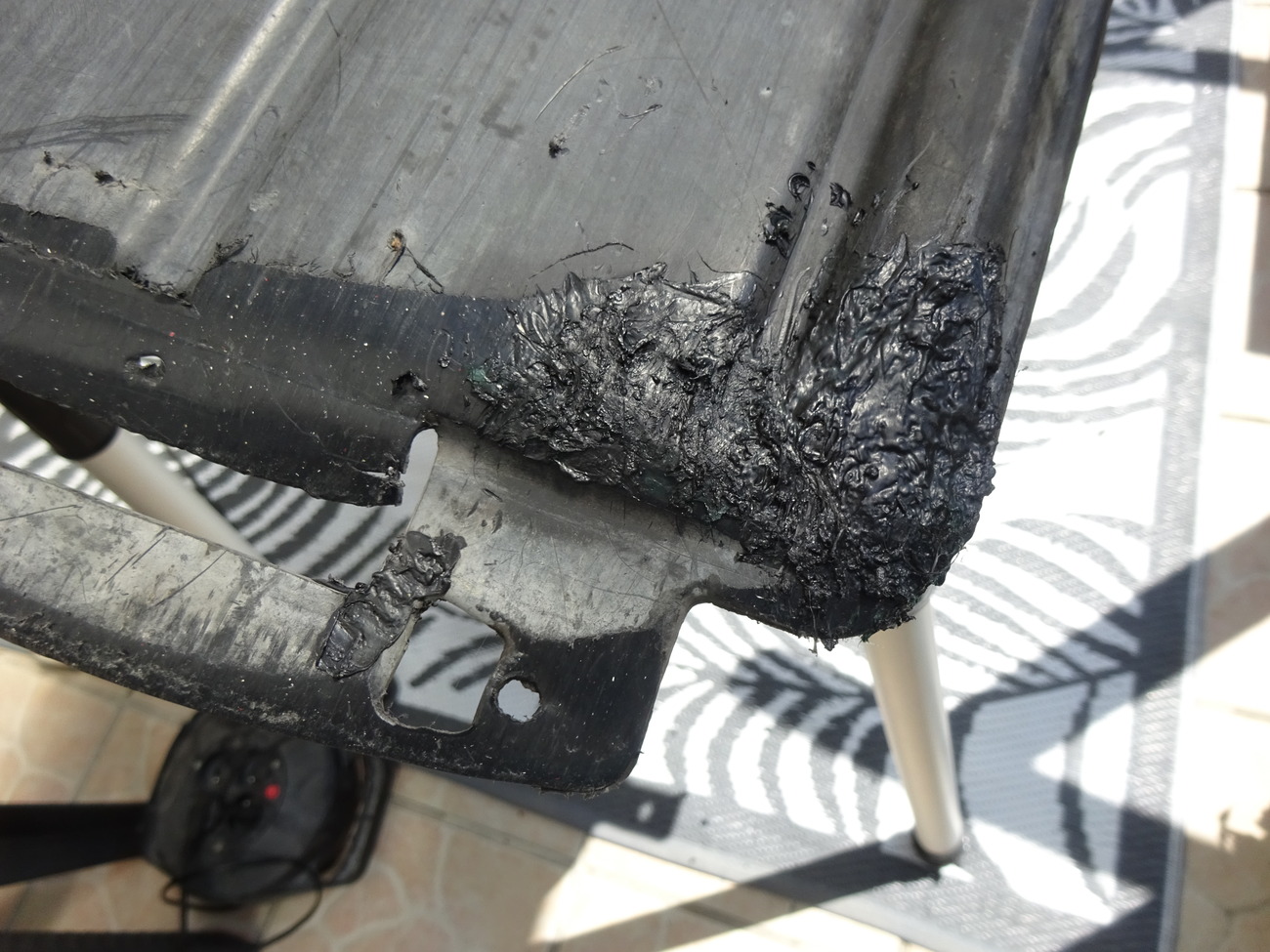 une patte de fixation au niveau de la boîte complètement tordue la voiture est défoncée dessous il y a même des trous en étoiles dans le cache les têtes de vis de berceau . Enfin voilà quelques agraffes avec l'agraffeuse thermique , rebouchage avec les moyens du bord bout de plastiques et fer à souder souflant c'est pas beau mais ça tient j'attends les aggraffes en U perdues pour remonter tout ça