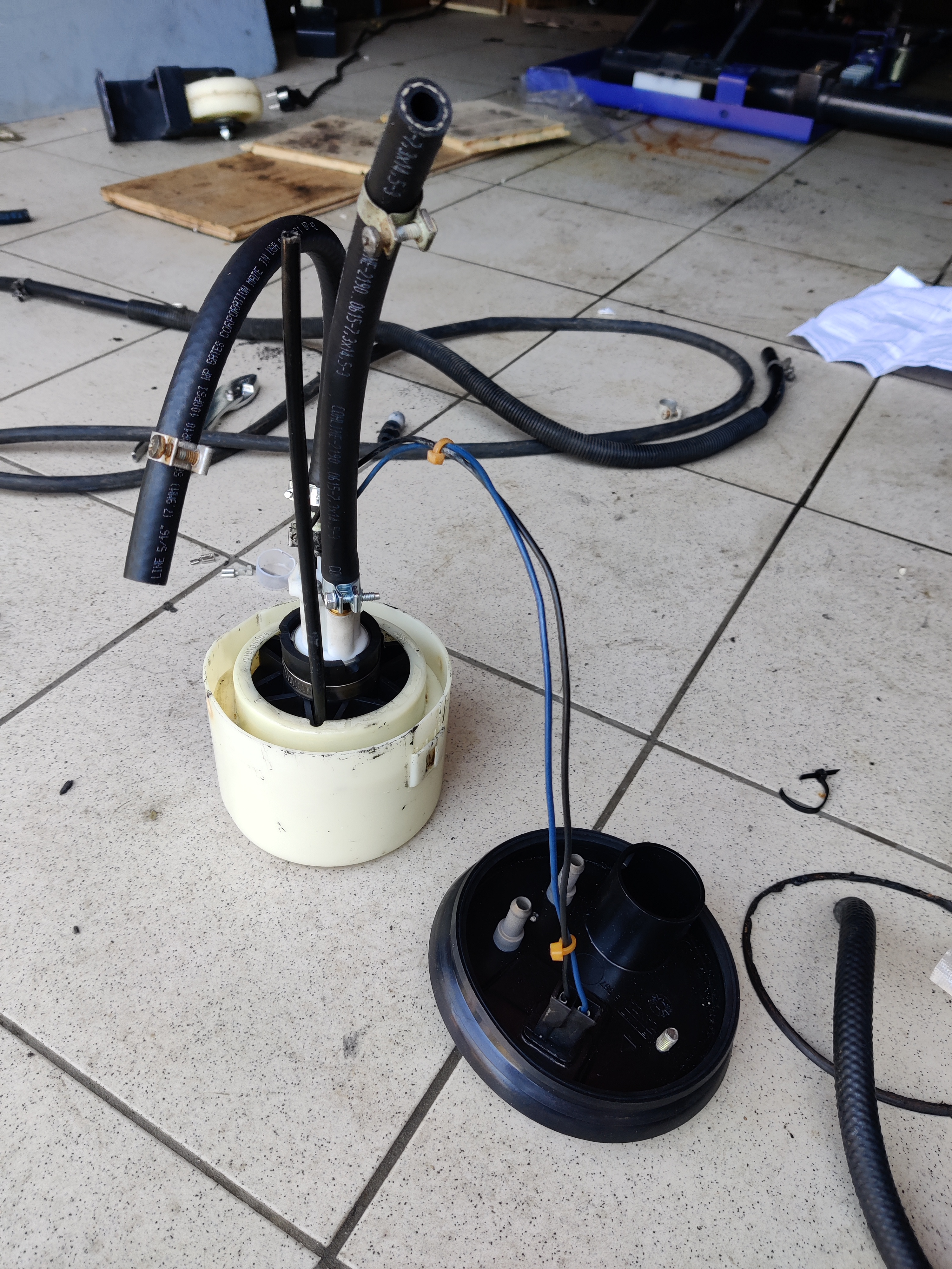 On ne saura jamais si on s'est trompé au montage où si le soucis est ailleurs, en enlevant la gaine isolante sur le cable d'alimentation de la pompe (au dessus du réservoir), on a constaté avec surprise qu'il était composé de 4 cables, dont deux coupés, je me demande si cette partie du faisceau n'a pas été refaite (elle aussi), et peut-être à l'envers. Bref...
