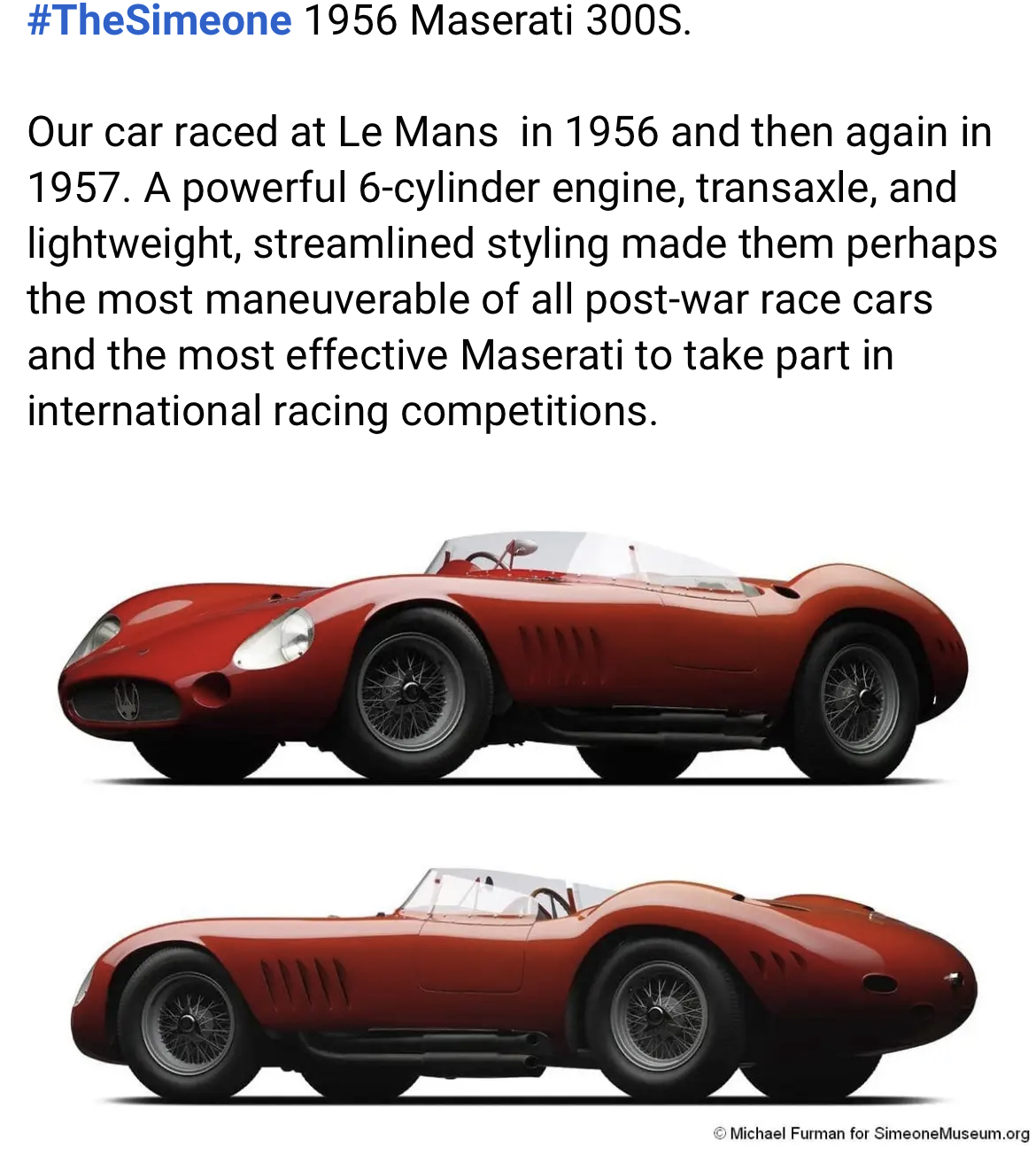 Construite en 1955, et pilotée dans un premier temps pour le compte de l'usine par les plus grands (Moss, Behra, Taruffi, etc...), cette 300S #3059 a été fermée en coupé en 1961 pour lui permettre l'homologation nécessaire à la participation en catégorie GT. Elle retrouvera son apparence initiale en 1972.