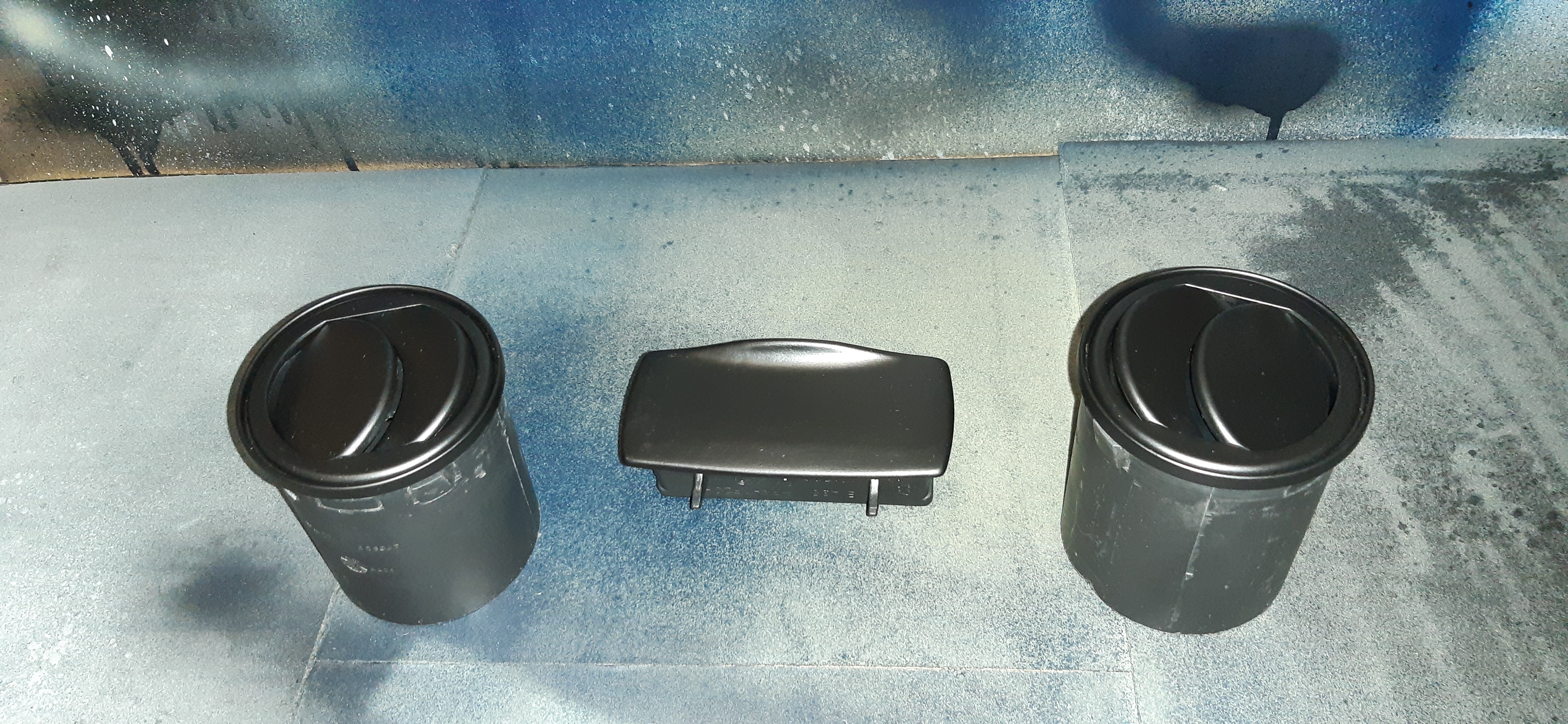 J'en ai aussi profité pour travailler sur la peinture des aérateurs et du cendrier arrière qui étaient collants et non traités par le précédent propriétaire. Il avait déjà fait l'avant. Après décapage à l'alcool à brûler, réparation d'un axe de rotation cassé (avec insertion à chaud d'une tête de petit clou -"sans tête"!-), puis dégraissage peinture, passage d'une couche de primaire pour plastique et deux couches de noir mat.