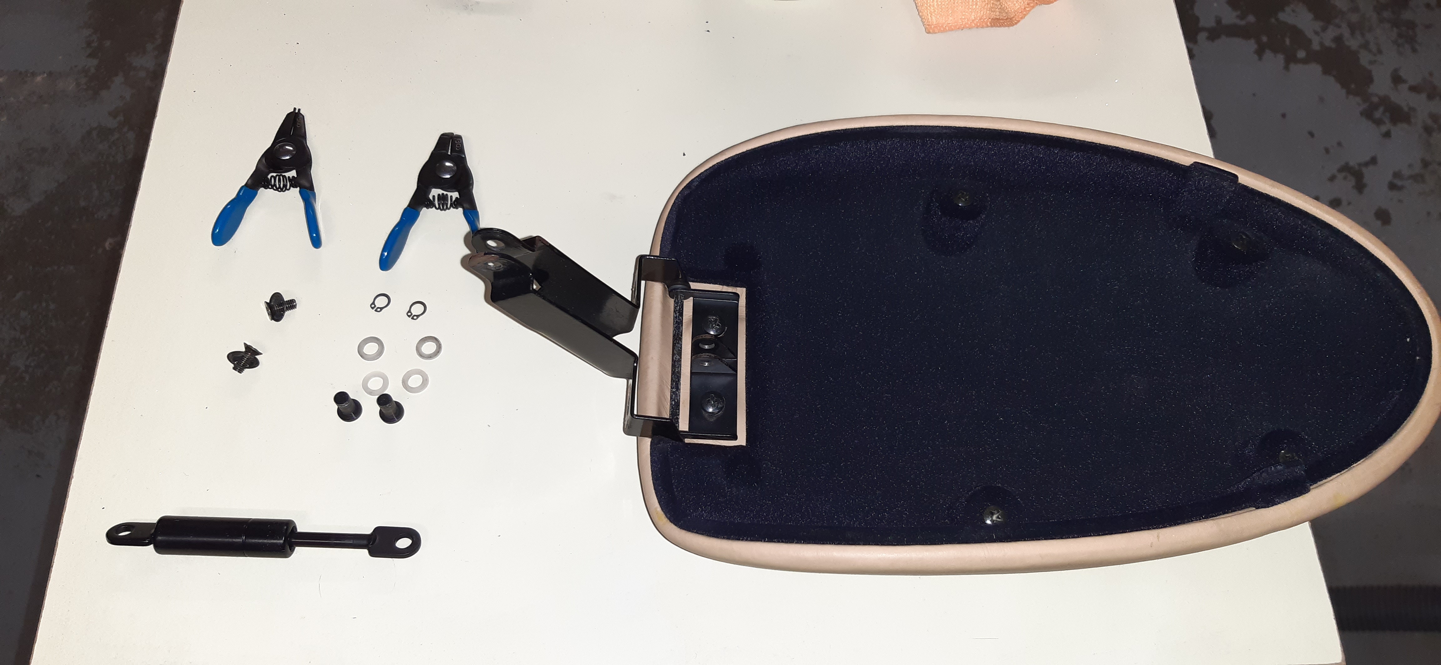 Il y a deux vis à défaire pour sortir le système accoudoir + vérin et la mécanique qui va avec. On peut ensuite travailler tranquillement sur l'établi. Il faut une mini pince à circlip, les pinces standard ont un trop gros diamètre pour rentrer dans les trous des circlips. Ci-joint quelques photos ;)