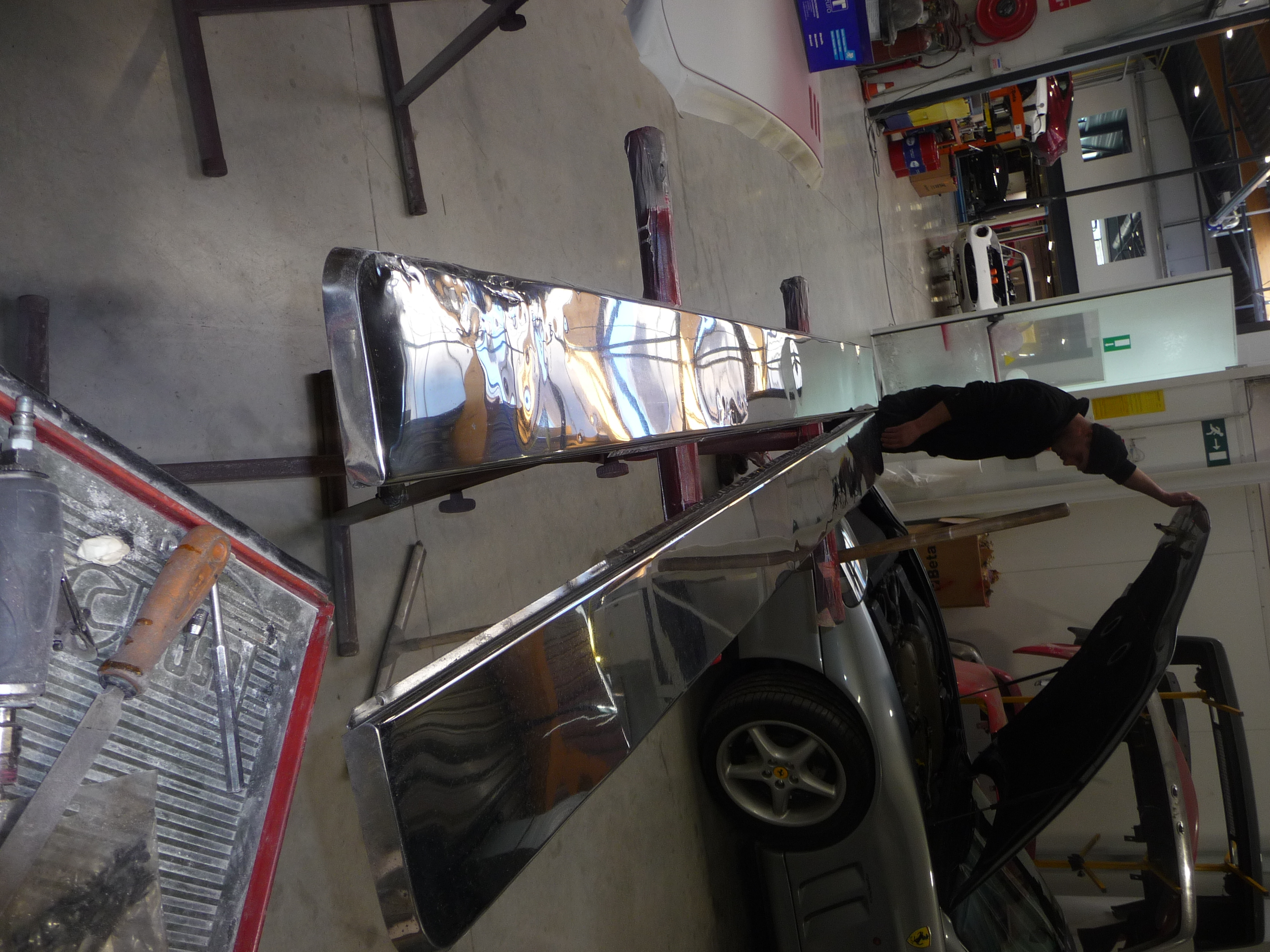 Du coup, le débosselage des grandes plaques inox latérales et le polissage des capuchons de roues (puis le re-chromage) prennent leur temps aussi, d'autant que l'artisan est surbooké...