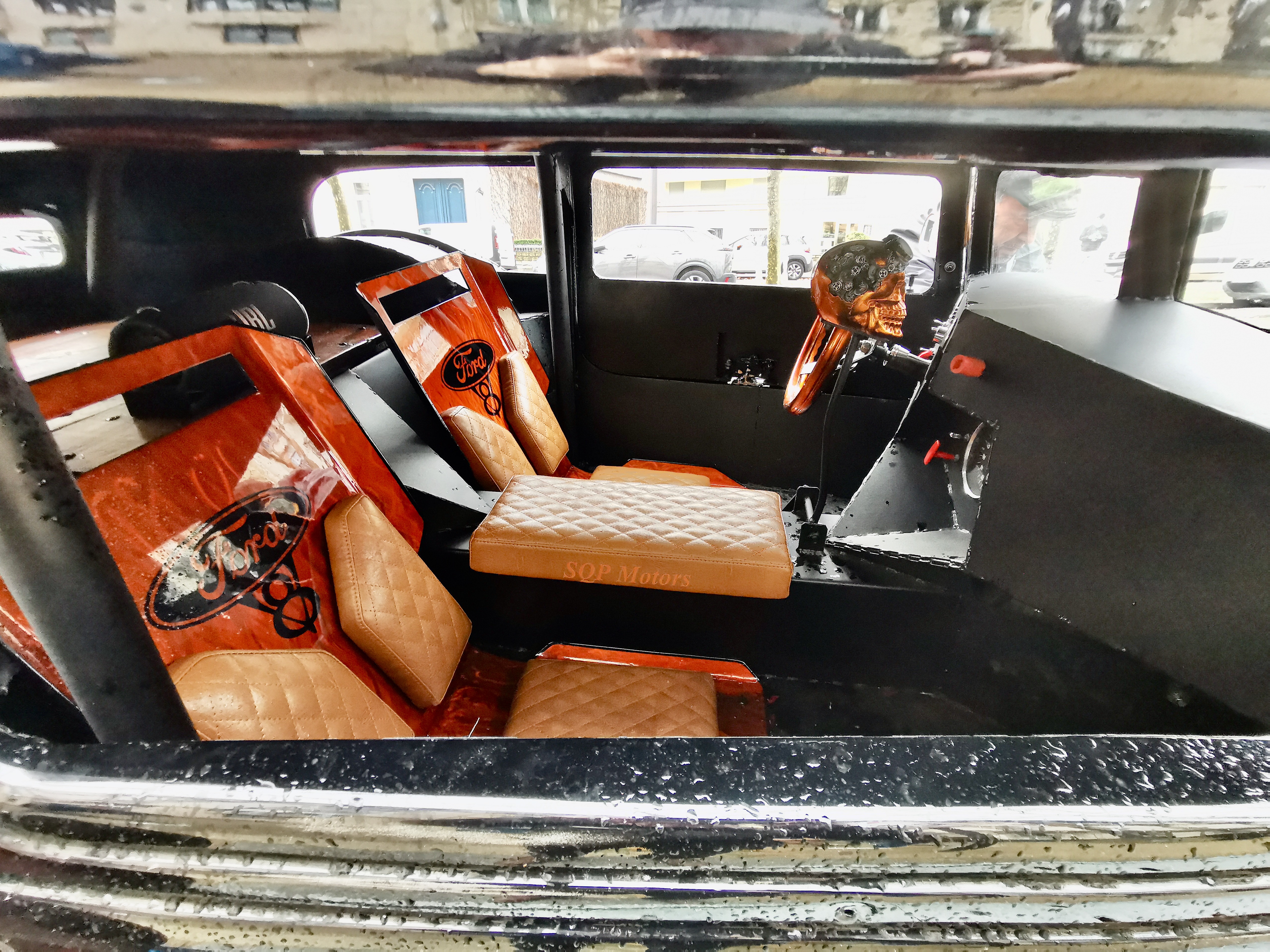 On voit bien le coffre déjà plein à gauche des pieds du passager....