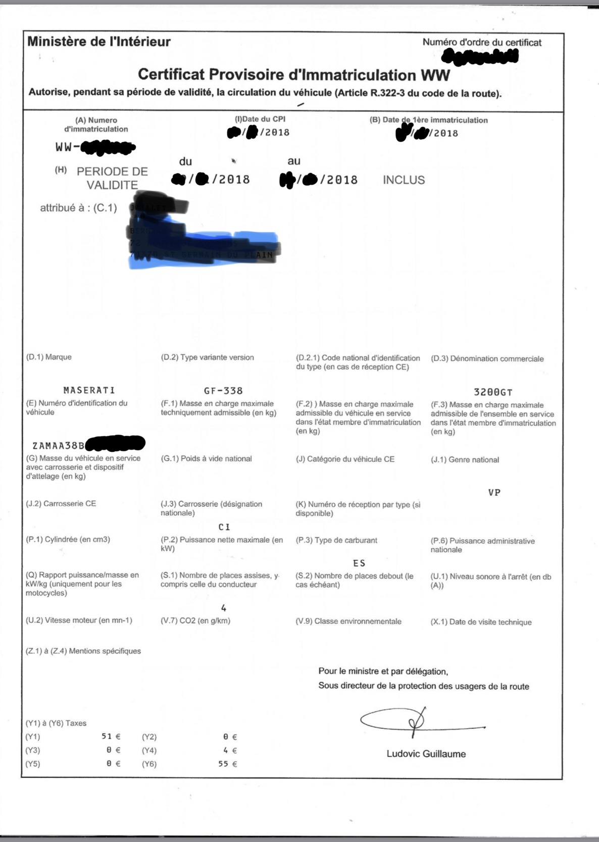 Je suis d'accord avec toi sur la plaque figure bien le N°e....mais mon garage fait ce numéro temporaire par Web et on lui demande le D2 qui ne figure pas sur les papiers japonais.Donc pour l'instant pas de temporaire et la situation est bloquée et cela complique mon acquisition du COC pour l'immatriculation définitive car Maserati Paris et Orleans veulent voir la voiture pour émettre un COC.C'est la politique Ferrari.