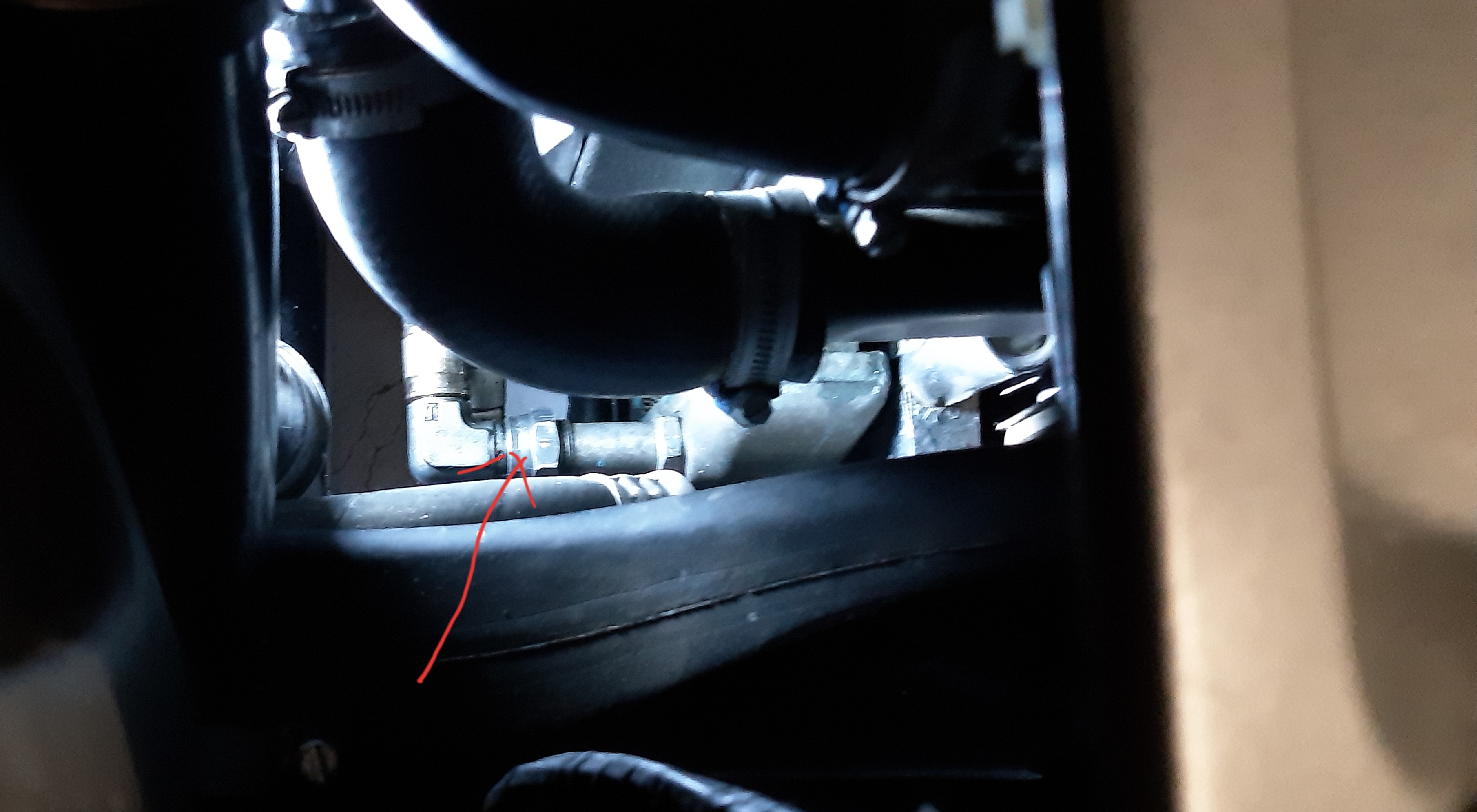 Vue du dessus, l'avant de la voiture à droite. Suintement au bout de la flèche rouge. Raccord de la conduite sur le radiateur.