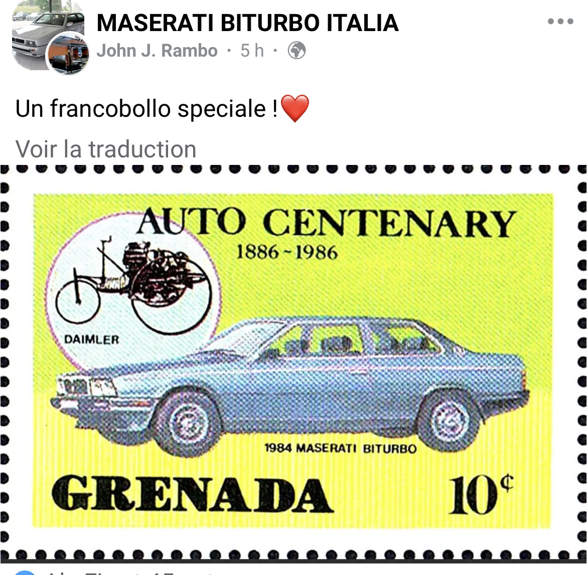 Un timbre (francobollo) qui était sorti pour le centenaire de l’automobile :