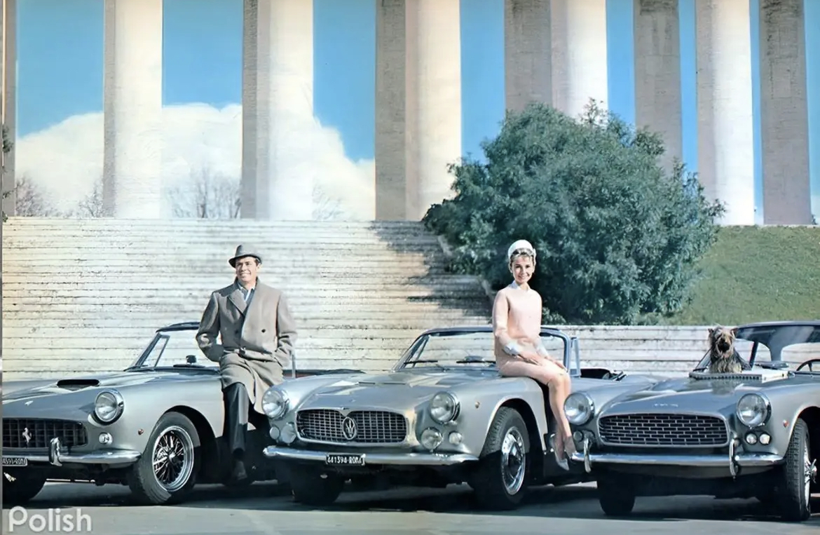 En 1961 à Rome, Audrey Hepburn juchée sur une Maserati 3500GT Spyder Vignale, son chien Mr Famous sur une Triumph Italia et son mari près d’une Ferrari 250 California :