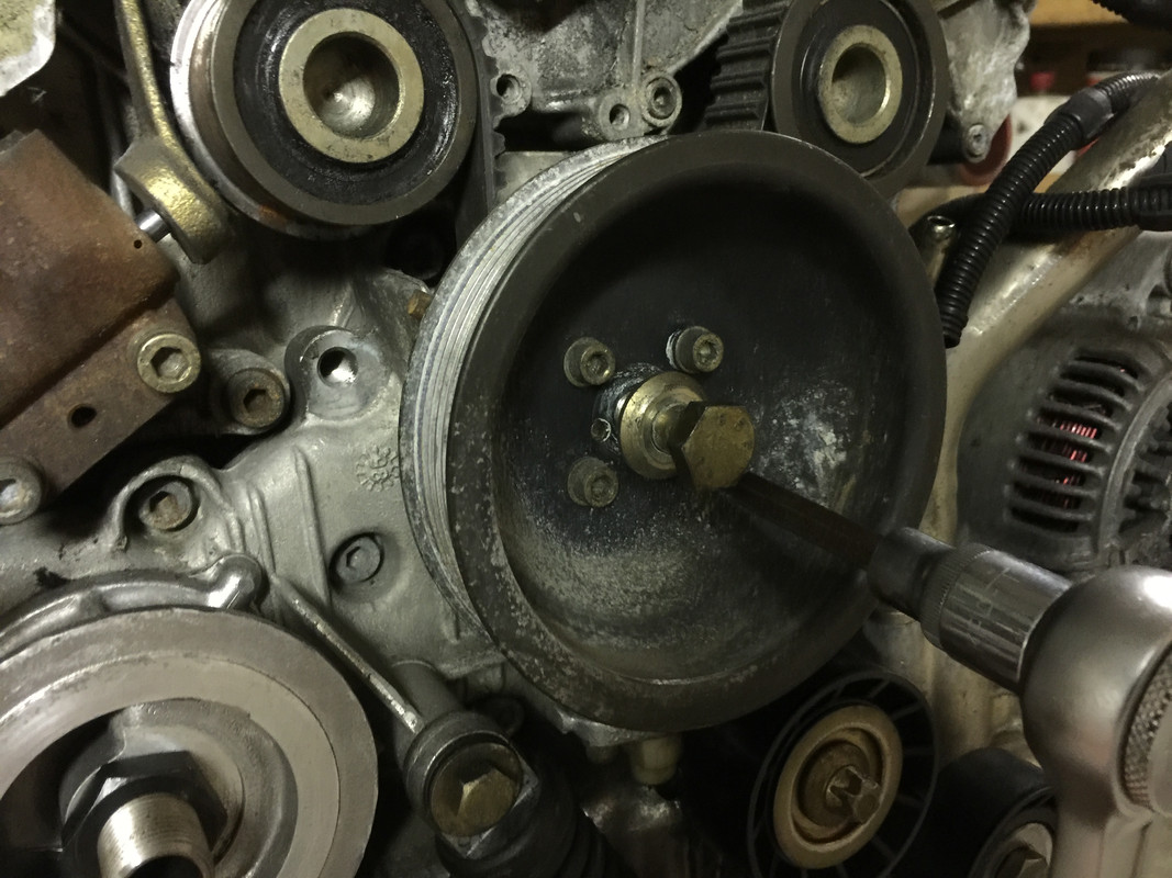 Tout d'abord bloquer le volant moteur pour dévisser la poulie d'accessoires