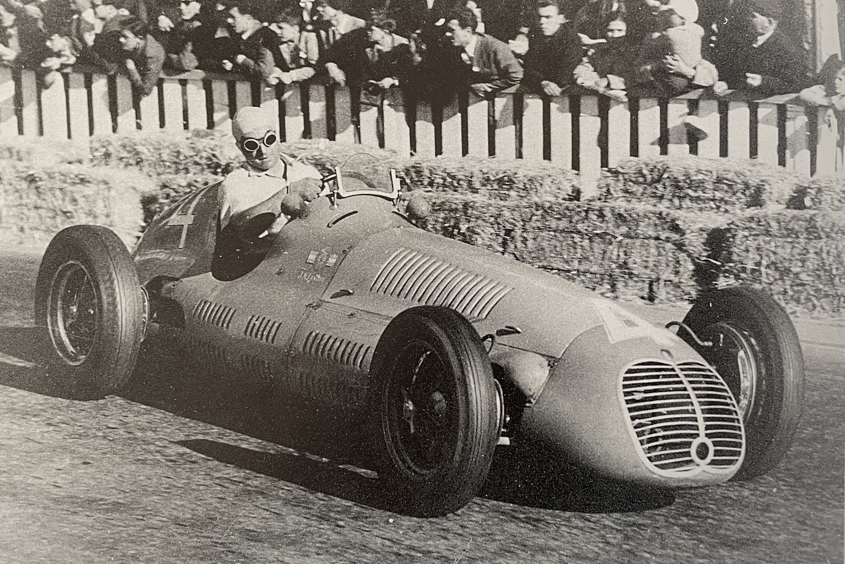 Nino Farina, premier champion du monde de Formule 1 en 1950 sur Alfa-Romeo, ici aux commandes d’une Maserati 4CLT dans une attitude qui révèle la force centrifuge et l’adresse du pilote. La Maseratitude !!!