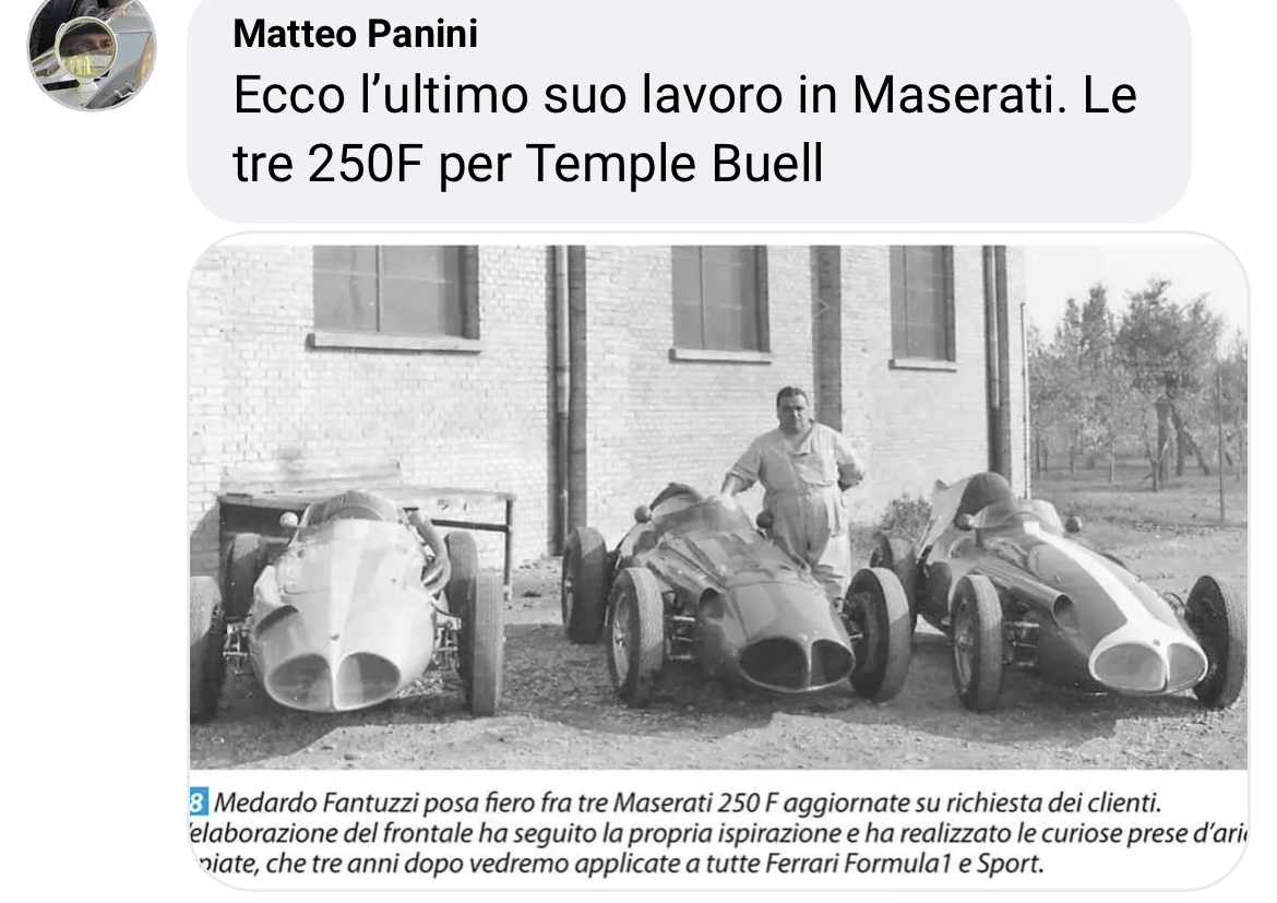 Medardo Fantuzzi, dit « le prince de l’aluminium », a carrossé presque toutes les Maserati de course (sauf en 1954-1955 où il était débordé par les commandes) de la première en 1926 jusqu’à celles-ci, les ultimes 250F en 1958 :