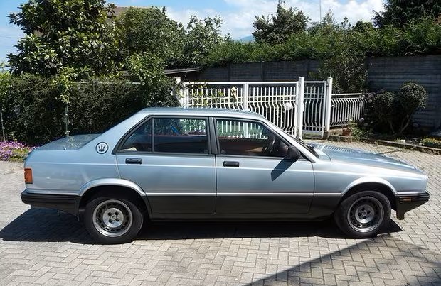 L’équilibre des volumes tricorps de cette berline est vraiment excellent, je trouve. Les parechocs échancrés sont caractéristiques de la première période des Biturbo (avant 1988) et du tout début de la seconde, ils accentuent l’aspect dynamique et la finesse du profil :