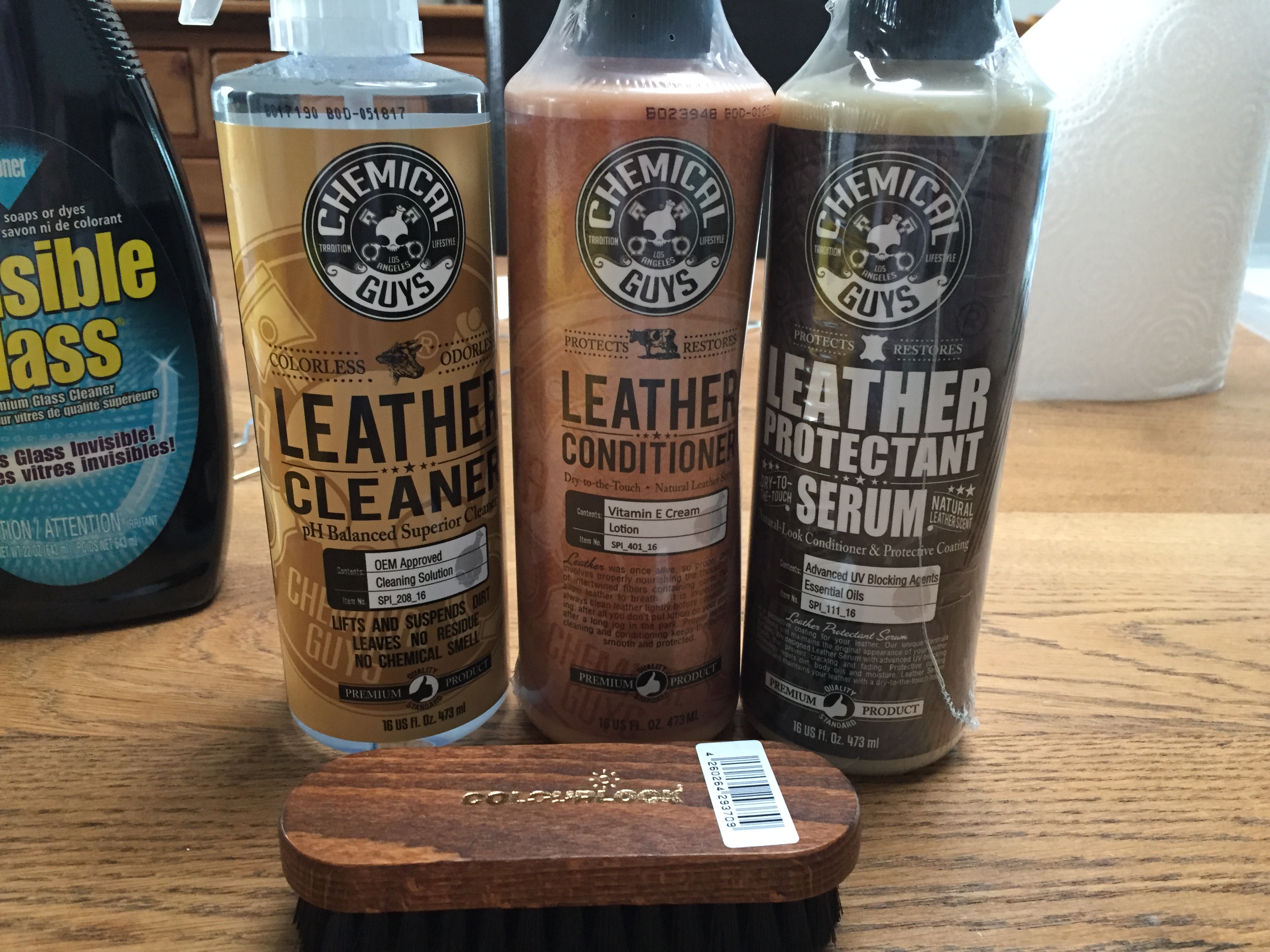 Pour les cuirs j'utilise le tryptique des Chemical Guys et une petite brosse. Avec de l'huile de coude c'est parfait !!