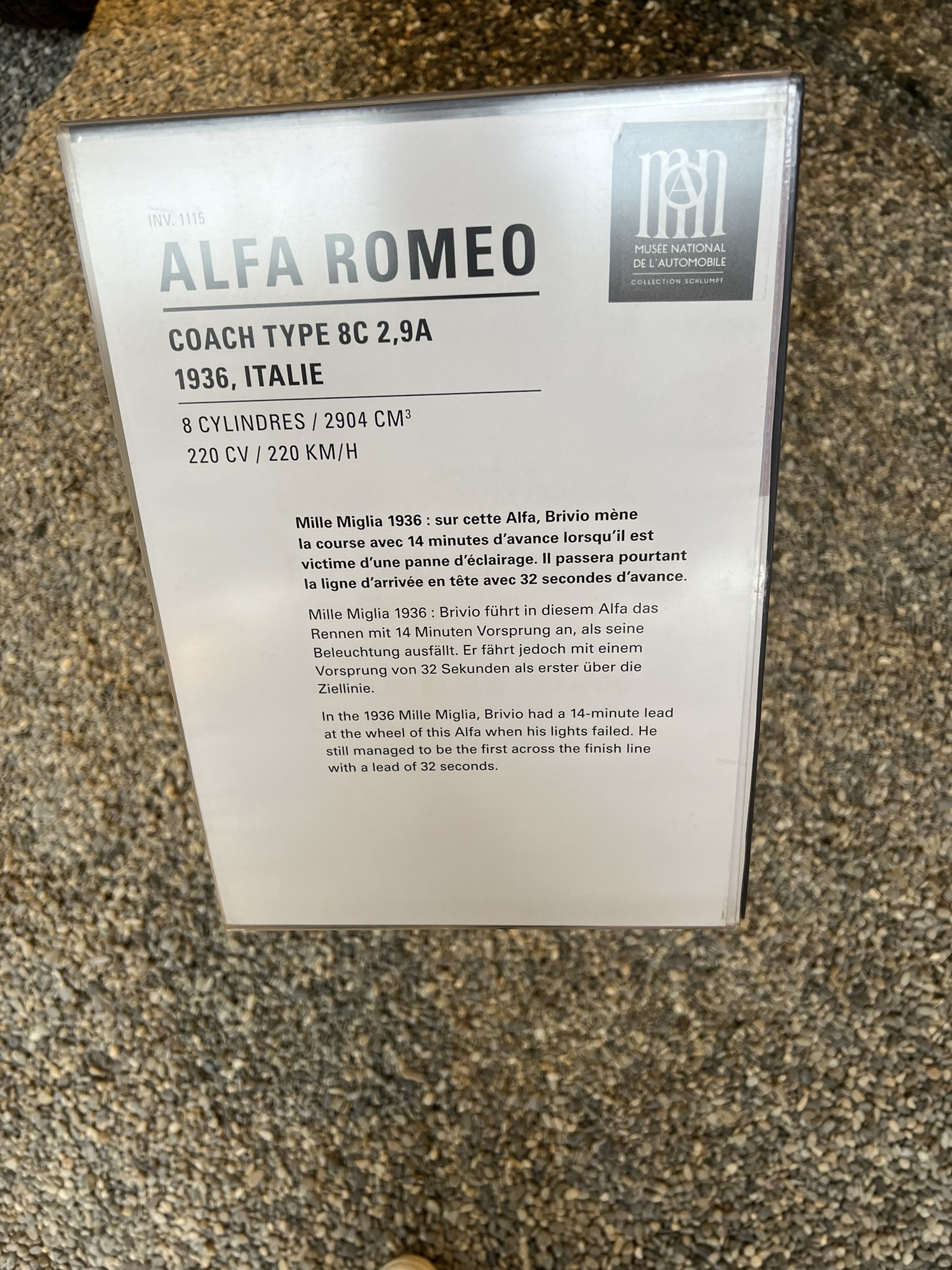 Suit la merveilleuse visite de la cité automobile de Mulhouse : plus de 400 véhicules sur 25 000 m², avec quelques beaux exemplaires de Maserati mais surtout la plus grande collection de Bugatti au monde, dont 2 Royale, 3 Atalante et une tripotée de type 35 et type 57 !!