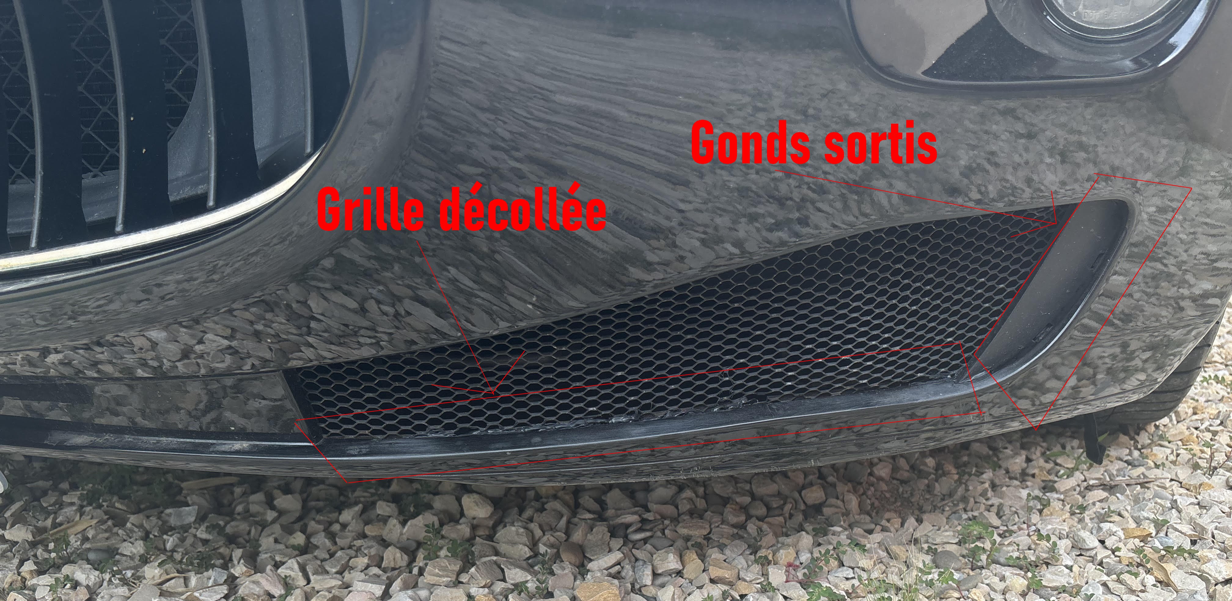 ), en voulant se garer en ville, a rapé sous le pare choc avant. Ca ne se voit pas trop mais c'est quand même dérangeant. Le plus important toutefois, c'est que les deux grilles en métal de par et d'autre du pare choc, sont sorties de leur emplacement et se sont décollées. Je n'arrive pas à les refixer correctement. Auriez vous une solution ou c'est passage obligé chez le carrossier ?