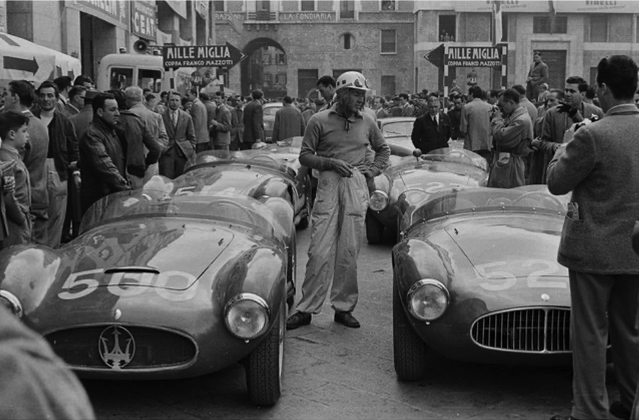 La légende automobile italienne s’est construite autour de courses sur routes ouvertes, à commencer par la Targa Florio créée en 1906, et bien sûr les Mille Miglia à partir de 1927. Alors qu’en France l’hécatombe du Paris-Madrid en 1903 (10 morts entre Paris et Bordeaux, dont le constructeur Marcel Renault) conduit les autorités à privilégier les courses sur circuit, les courses sur route italiennes attirent un très large public dans toute l’Europe et deviennent après la Seconde Guerre Mondiale un enjeu de communication pour les marques automobiles. Problème : les voitures n’ont pas à l’époque des logos de sponsors pour différencier les différentes équipes. Les couleurs sont définies par le pays du constructeur: rouge pour l’Italie, bleu pour la France, argent pour l’Allemagne,… Comment faire pour que le public massé au bord des routes puisse reconnaître sa marque favorite sur les voitures qui passent à grande vitesse ?