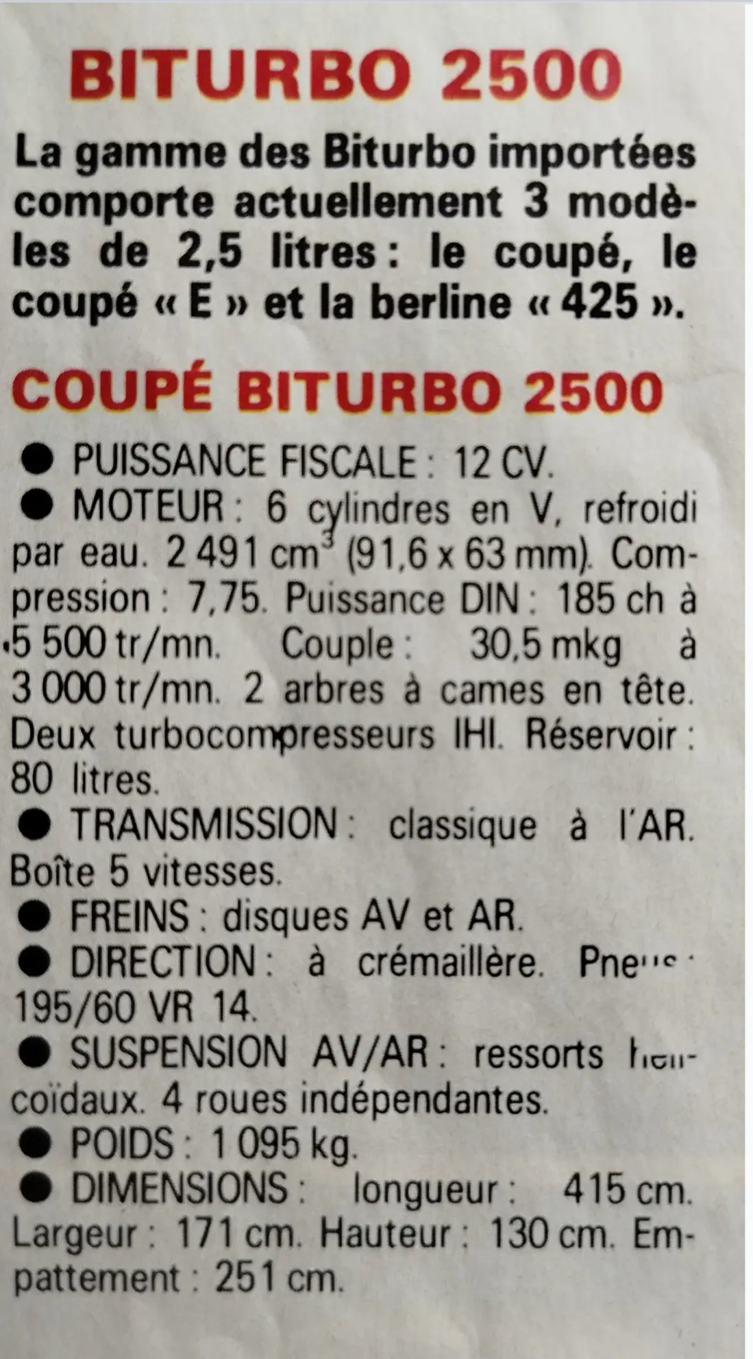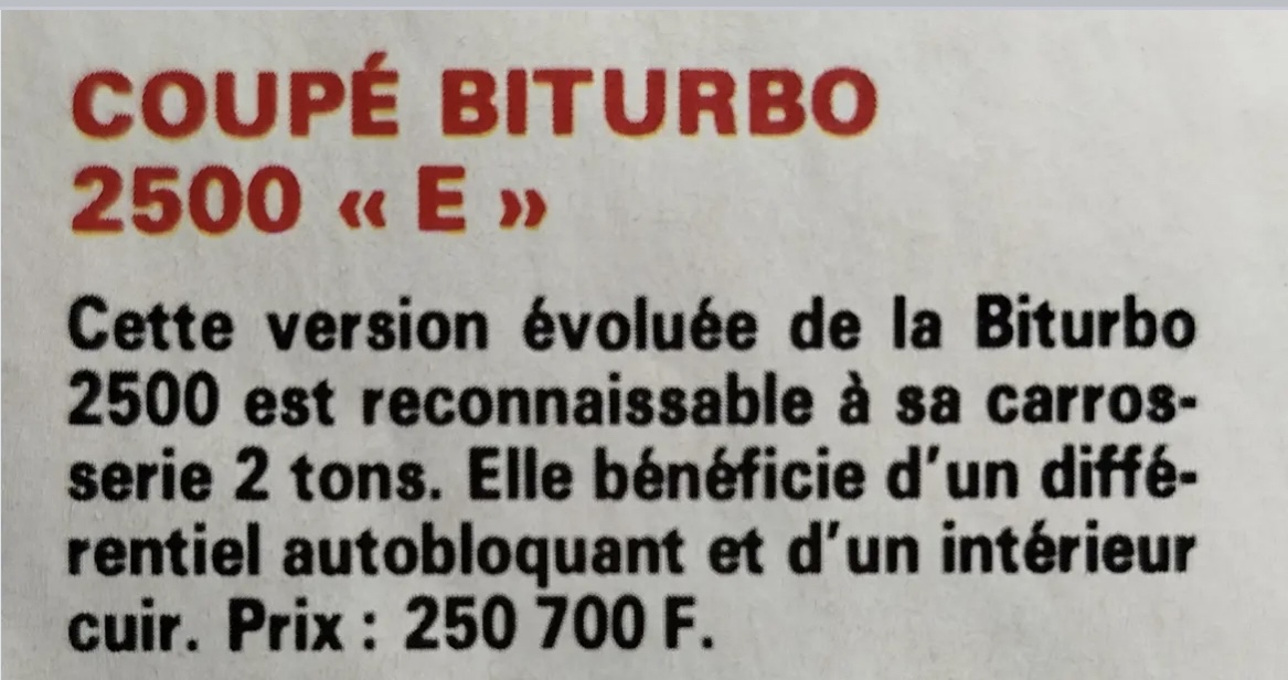 plus d'infos sur la Biturbo E qui était un coupé 2.5 litres à suspensions raffermies et look des Biturbo S italiennes 2 litres mais sans intercooler :