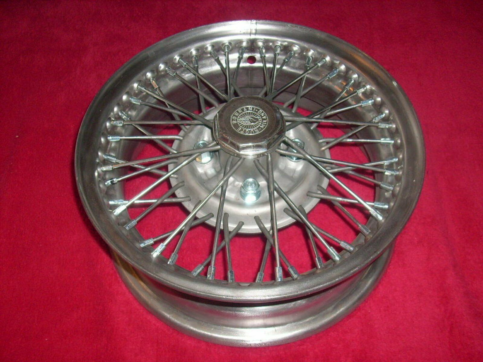 Ci-dessous une roue de Maserati 3500 GT, jante alu poli et rayons chromés, telle que vendue encore aujourd’hui par Borrani, avec le capuchon Borrani à trois oreilles :