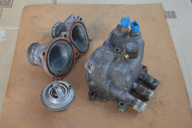 Étant donné que le collecteur d'admission a été laissé retiré à la fin de l'année dernière, j'ai retiré le coupleur du capteur de température de l'eau, retiré le tuyau du radiateur et retiré le couvercle du thermostat tout en retirant le LLC . Ceci est le couvercle thermique retiré. Le joint torique est toujours élastique et la section transversale reste ronde. Peut-il être utilisé? Puisque LLC reste, aspirez-le avec une seringue à mâcher et en plastique. Vous pouvez voir l'emballage du boîtier thermo sur le côté gauche (sur le côté droit lorsque vous faites face) où le thermo est inséré . Cela ressort beaucoup à l'intérieur. Je me demande si elle est à l' origine de cette taille ou si elle gonfle avec la chaleur. Au fait, les pièces détachées Euro sont en rupture de stock. Trois tuyaux sont coincés à l'arrière du boîtier thermique. Pour le refroidissement entre les berges gauche et droite et le turbo. J'ai réussi à retirer le collier de serrage de type calfeutrant que j'aurais dû remplacer lorsque j'ai remplacé le démarreur il y a longtemps, en le calfeutrant avec un tournevis à lame plate, mais il est fermement attaché et le tuyau ne se détache pas. Après avoir poussé le tournevis et pulvérisé le spray de silicone, j'ai réussi à le retirer avec succès. Les restes de Gotteri et LLC collent ensemble, surtout au milieu (rires) Lorsque vous retirez le boîtier thermique , l'emballage en caoutchouc ressemble à buyobuyo, mais en réalité, le caoutchouc n'est plus élastique et se fissure. J'ai réussi à le décoller pour qu'il ne tombe pas à l'intérieur, et pour le moment , le polir avec de la pierre à huile et le guérir avec du ruban adhésif. La dernière fois, j'ai vu le vert de LLC sous le capteur de température de l'eau, mais c'était une entaille assez profonde et environ 30 à 40 cm3 se sont accumulés. Au fait, le boîtier thermique et le couvercle thermique que j'ai enlevés ont beaucoup à faire, alors sablons demain. (^^ v L'emballage du boîtier thermique est en rupture de stock, je prévois donc de le fabriquer moi-même avec une feuille de caoutchouc fluoré de 1 mm. Je l'ai commandé à Monotaro avec les boulons de montage immédiatement.