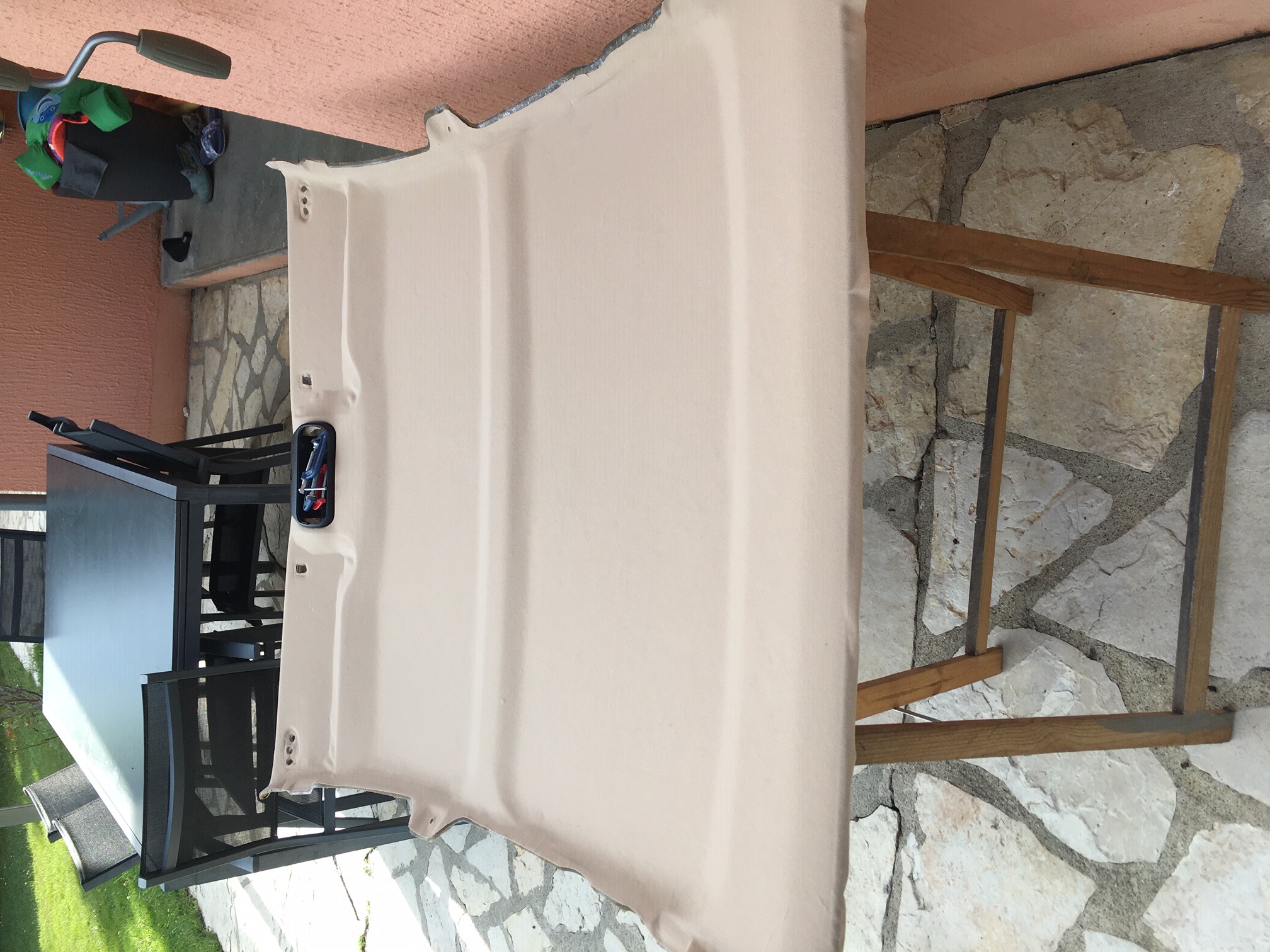 J'ai décidé de démonter la banquette AR et les garnitures AR pour bien accéder à l'ensemble du ciel de toit. C'est du boulot mais ça se fait bien et on arrive ensuite à sortir le ciel de toit de la voiture. Cette mousse qui se délite entre le support et le tissus est vraiment dégueux et il faut faire attention de ne pas en mettre dans la voiture ou sur les sièges.