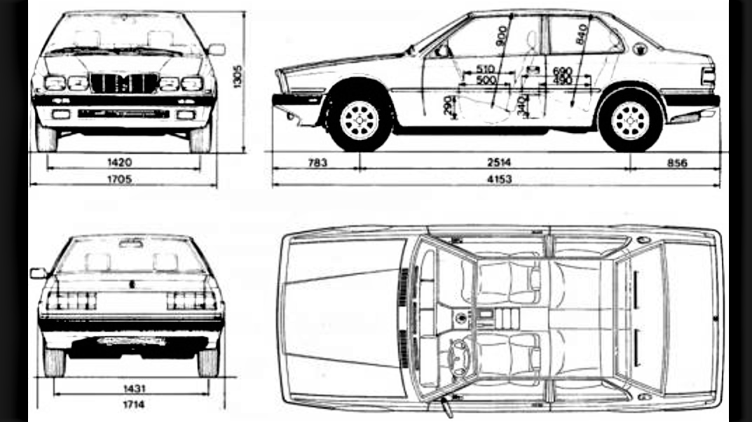 La 228 mesure 1.82 mètres de large (+ 12 cm par rapport à la Biturbo) et 4.46 mètres de long (+ 29 cm par rapport à la Biturbo). L’empatement de la 228 est celui de la berline 425 présentée en décembre 1983 (2.60 mètres soit + 9 cm par rapport au coupé Biturbo) :