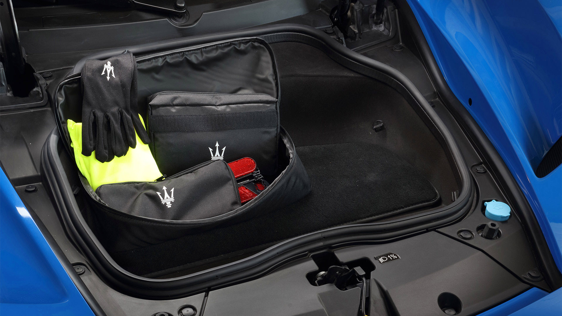 Le coffre est donné pour 150 l: 100 derrière le moteur, 50 à l’avant, partiellement occupé par le « kit de survie » (nan, pas un