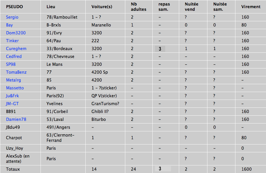 En bleu ceux qui ont confirmé leur venue. Je dois faire confirmation et commande finale pour le 5 mai. Ca commence à urger un peu.