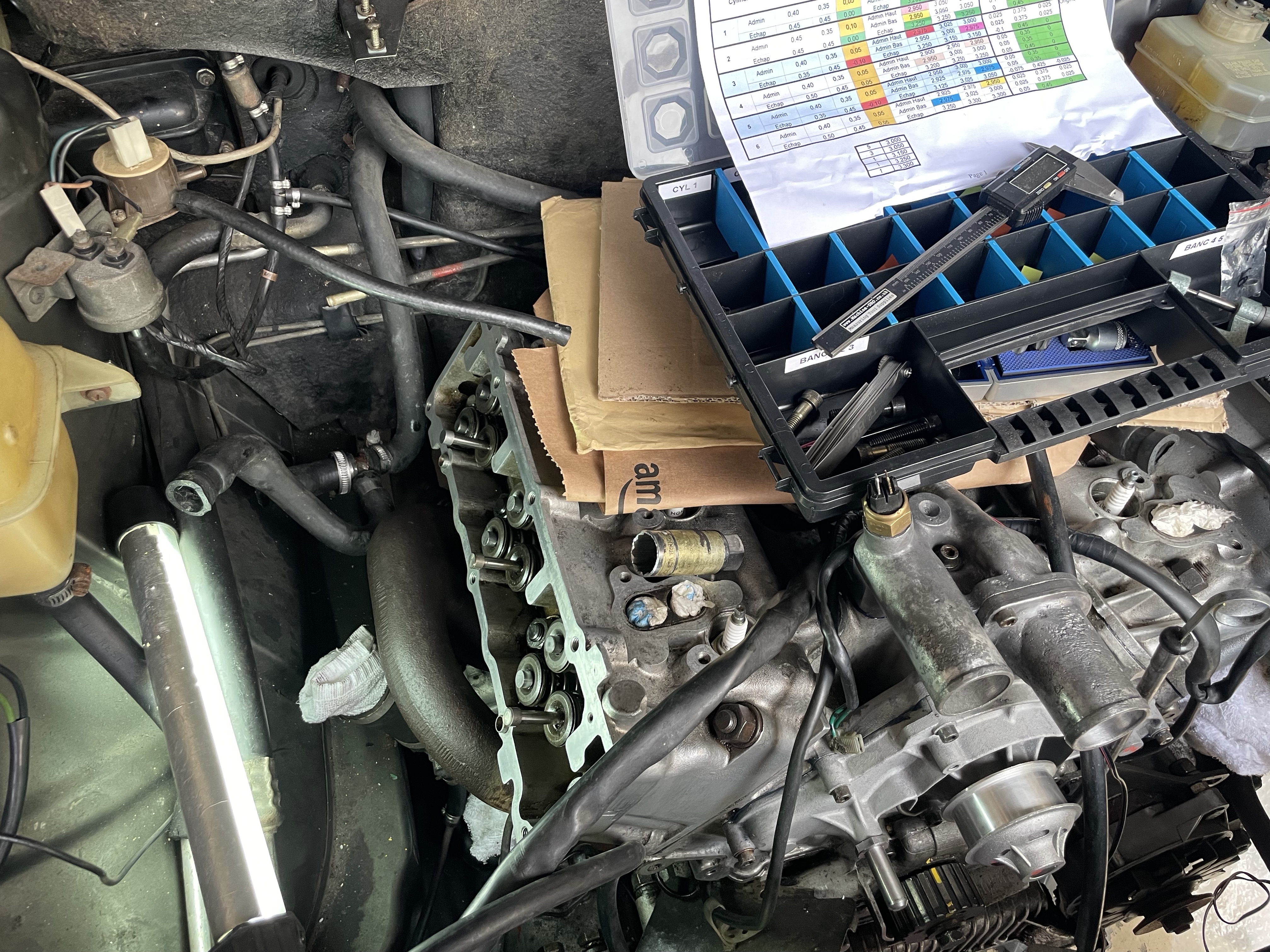 Nous avons donc acheté plusieurs pièces pour la voiture : pompe à eau, 6 soupapes, pack de joint complet, etc...