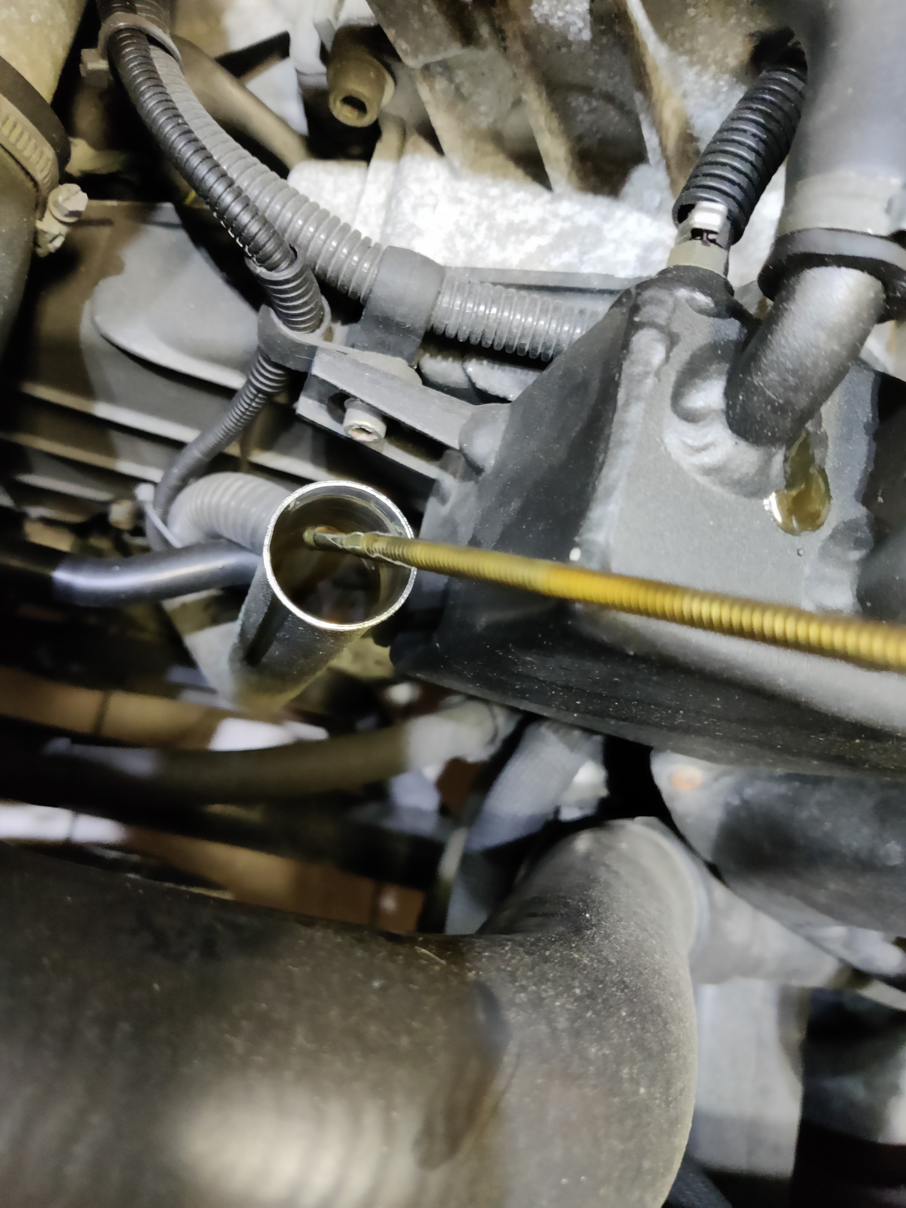 Alors, tout d'abord, en vérifiant le niveau d'huile, on se trouve un bon 8cm au dessus de la jauge (oui, il y a de l'huile jusqu'à l'extrême droite de la photo, pas de mayo pourtant.