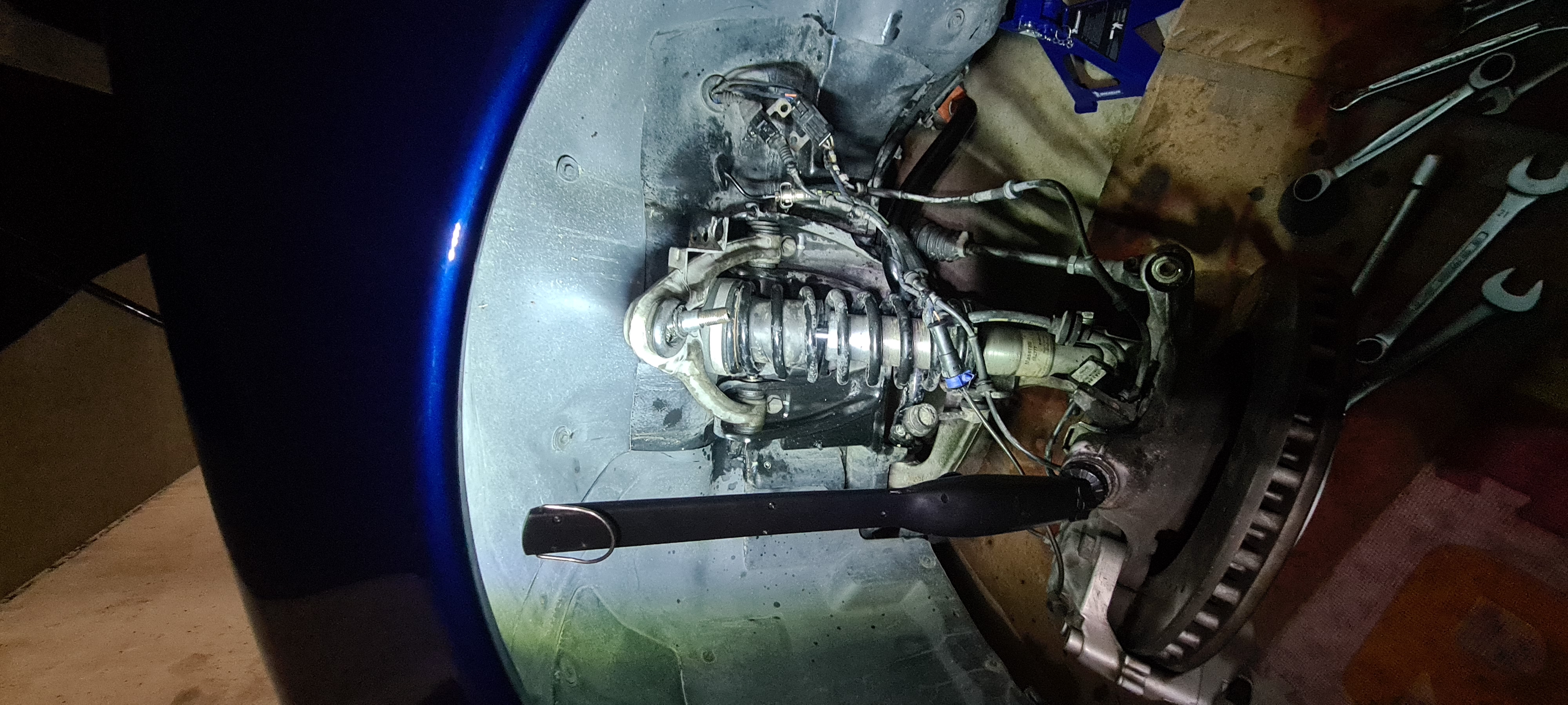 Il y a la durite rigide de frein qu'il faut dégrafé et bouger un peu pour gagner de la place et aussi le capteur abs. Ensuite tu peux placer un arrache rotule et après quelques tours de clef la rotule saute. Tu peux aussi faire sauter la rotule de direction pour être plus à l'aise lors du démontage.