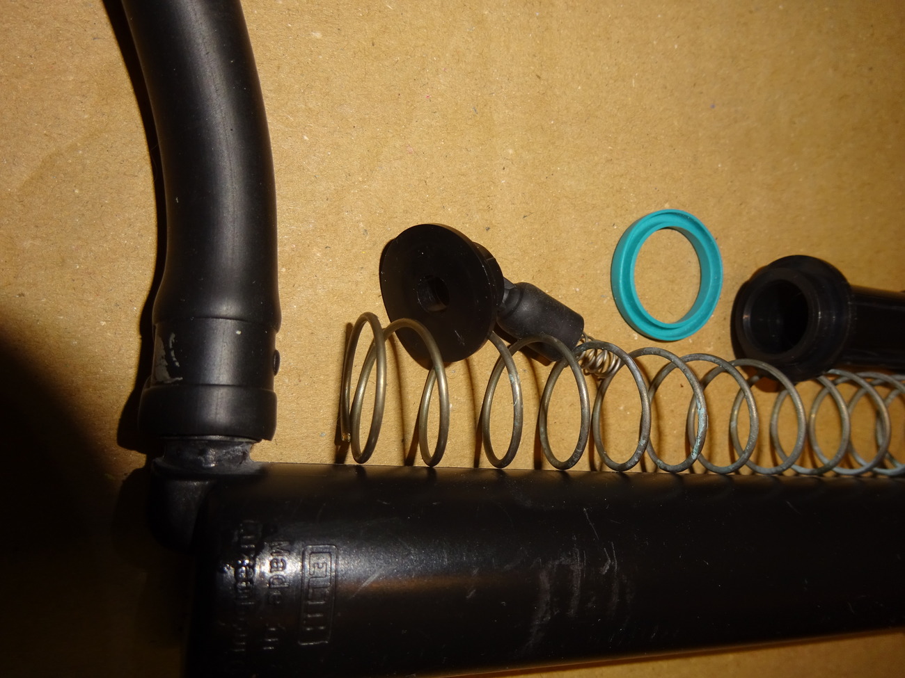j'ai ouvert le 2è piston et voilà le vieux joint , bizarre ses déformations d'ou les fuites bien sûr