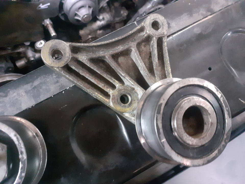 Pour la distri, ça a été le coup de grâce avant la fin. Il y a deux supports de galets. Ces deux supports sont fixés sur une tige filetée elle même fixée sur la baie moteur. Un des deux supports de galets avait ses trous de fixations oblong, ce qui faisait qu'il tremblait. L'autre avait la tige filetée foirée, ce qui faisait qu'il tremblait car on ne pouvait plus le serrer. Le cumul des deux faisait que la courroie se baladait dans ses galets. Même s'il n'y avait pas forcément de danger qu'elle saute, elle était poncée par frottements et là il y a avait vrai danger. Vu quelle n'avait que 1000km, je ne me voyais pas refaire la distri tous les 1000 km.