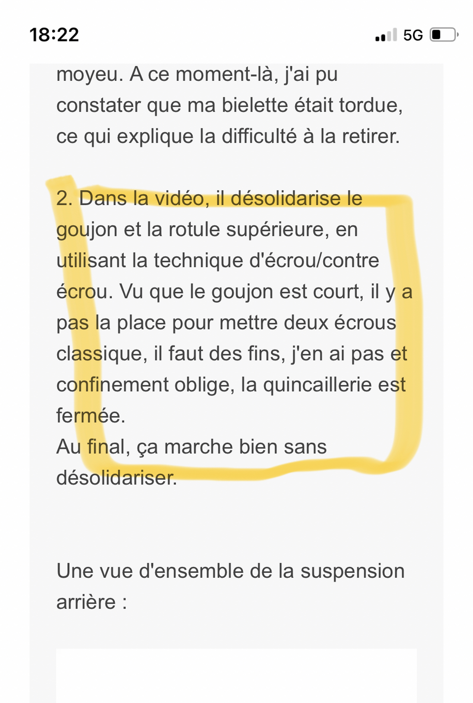 Pas cool... de mon côté, j'ai commandé le fameux écrou creux de 27mmm qui fait tant couler d'encre. Pas moyen de le retirer de la biellette sur l'établi. même en m'acharnant à chauffer et en perçant le centre de la biellette. Cette pièce étant censée être montée avec de la graisse, je me demande si quelqu'un n'a pas fait l'erreur de la coller par le passer.... Jamais je n'aurais cru rencontrer tant de problème pour sur ce train arrière.... donc attention à ceux qui veulent se lancer. C'est très aléatoire en fonction du véhicule. À bon entendeur