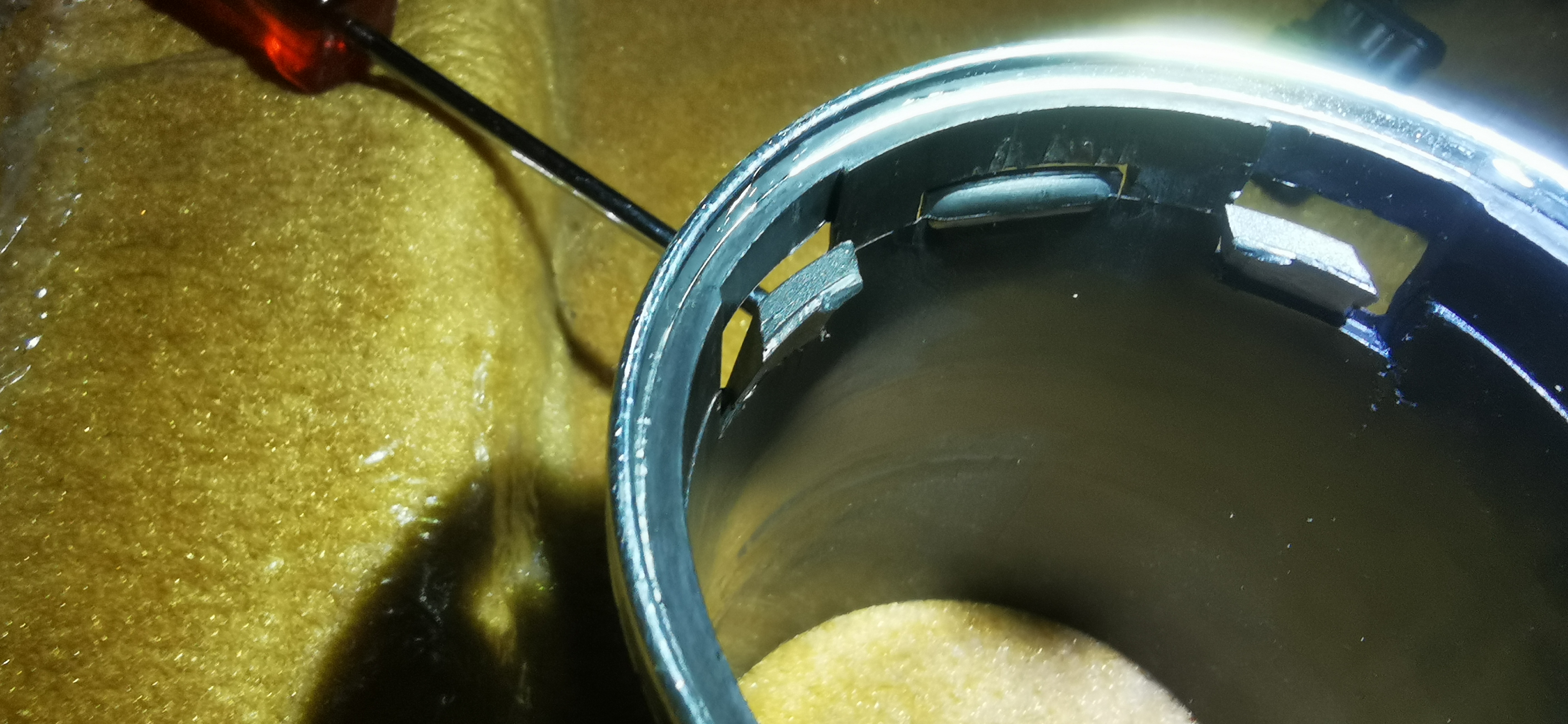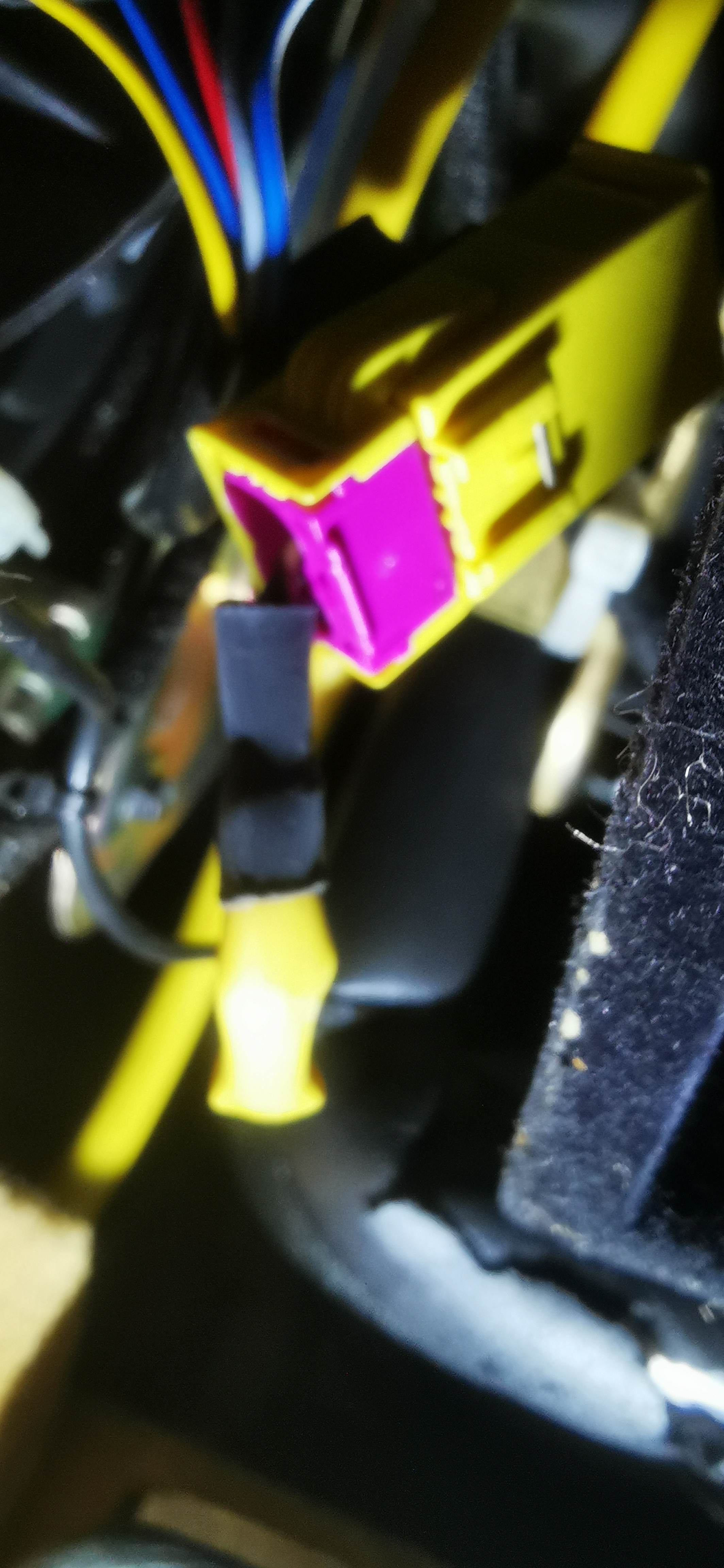 La tache à été un peu plus complexe que prévus, j'ai du séparer une partie du tableau de bord côté volant pour pouvoir passer les commodos sans les retirer. Pourquoi je vous parle du pommeau de vitesse, parce qu'il est venu forcer sur l'envers des boutons de réglage de chaleur et a éclaté toute la coque en plastique qui soit dis en passant est plus fragile que du cristal ! :x