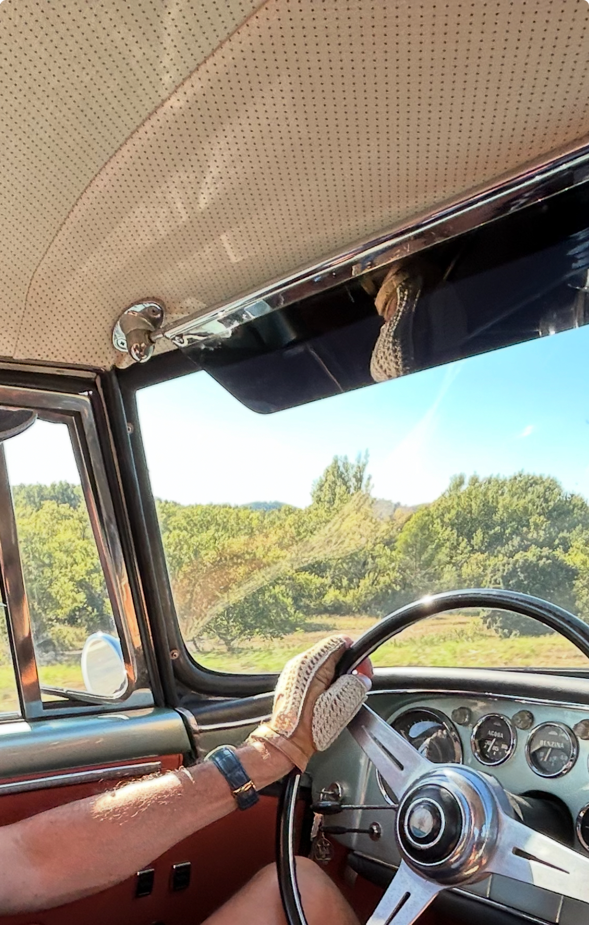 La jante du volant est très fine. Si il fait chaud et que l'on transpire, les doigts glissent un peu sur la bakélite du cerceau Nardi et des gants en cuir ou des mitaines aérées ne sont pas un luxe pour une bonne et sûre tenue du volant.
