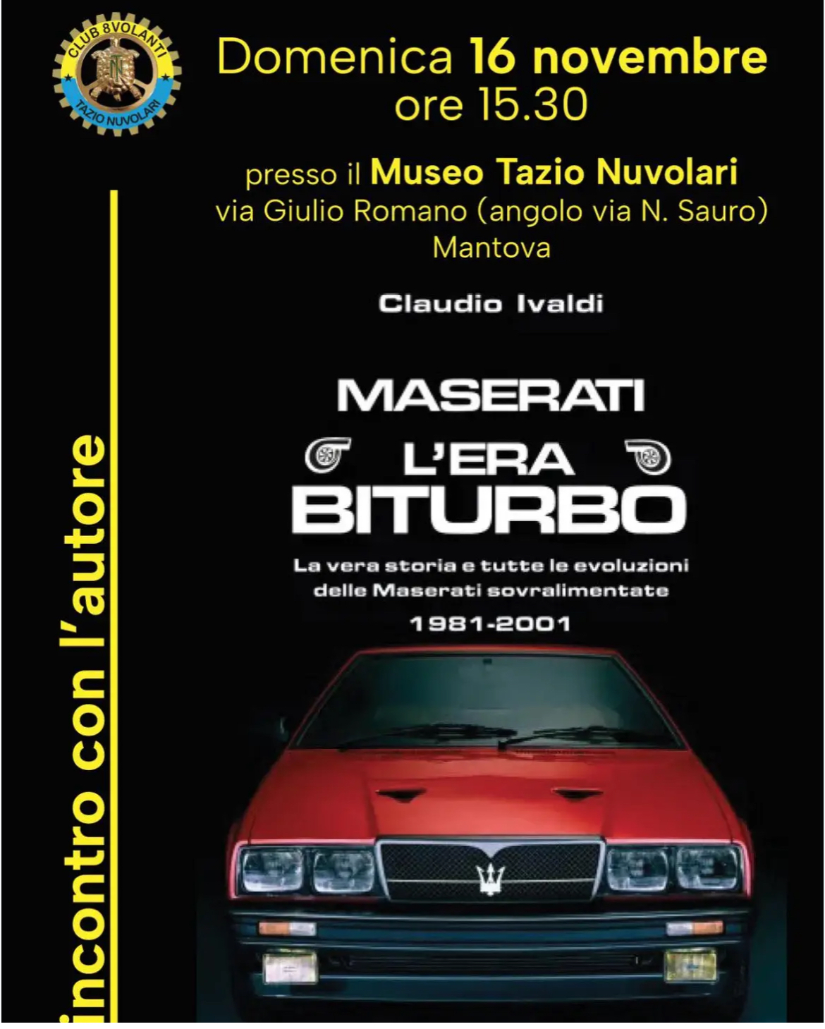 Le dimanche 16 novembre 2025, Claudio Ivaldi, le président du Maserati Club Italia, sera au musée Tazio Nuvolari de Mantoue pour présenter et dédicacer son livre, une véritable bible sur les Biturbo.