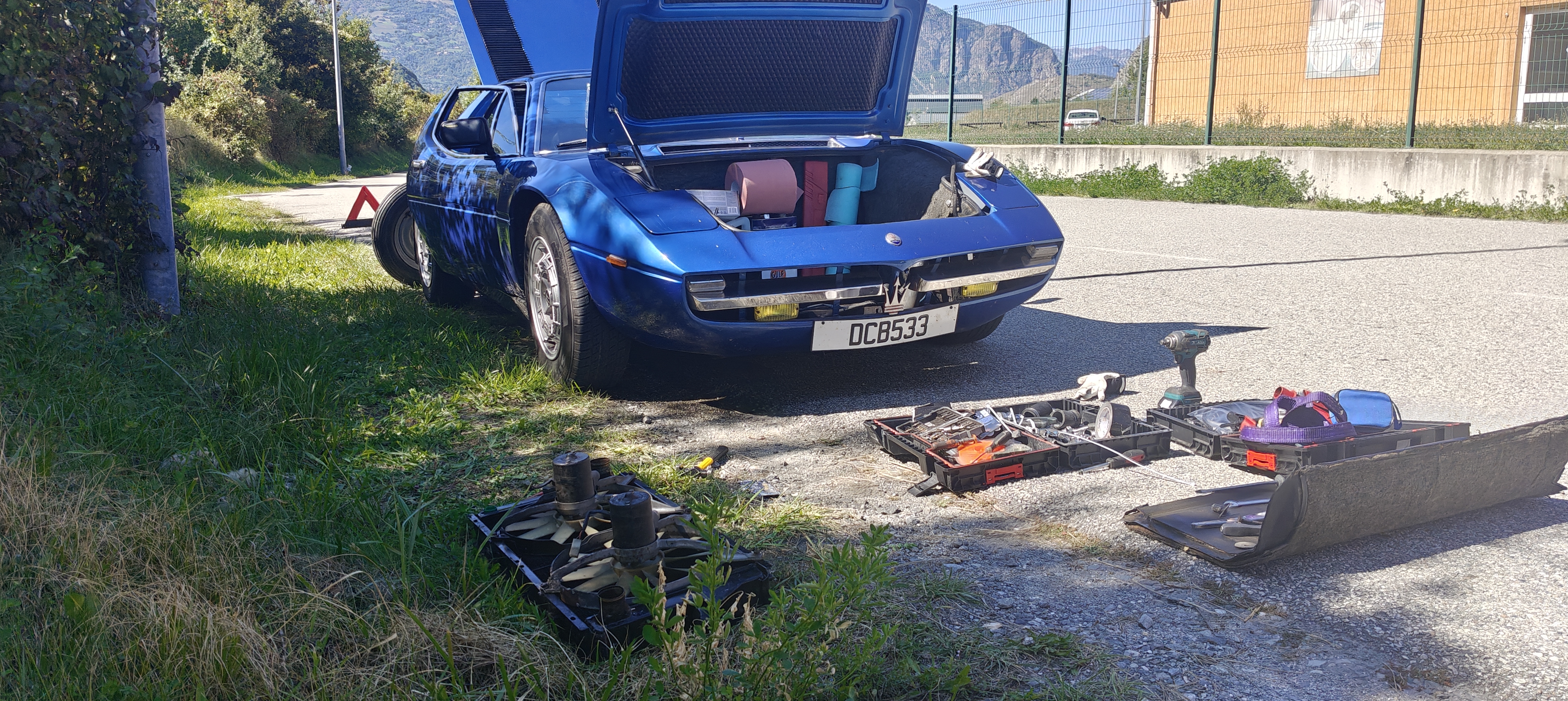 Sans trop de soucis une fois le radiateur remis en place, et l'eau du radiateur (oui, parce que trouver du LDR, c'était quasi mission impossible. Il y avait un garage à 800m, on y va à pied, non monsieur, on n'a pas de LDR (ben voyons), un deuxième pas beaucoup plus loin, "oui, pas de souci, mais amenez moi le bidon de ce que vous avez déjà dedans, il n'a rien voulu entendre, même quand je lui dis ce que c'est. Bref, on repart à la voiture chercher un bidon, et quand on revient, garage fermé -à 15h20) du coup de l'eau ce sera.