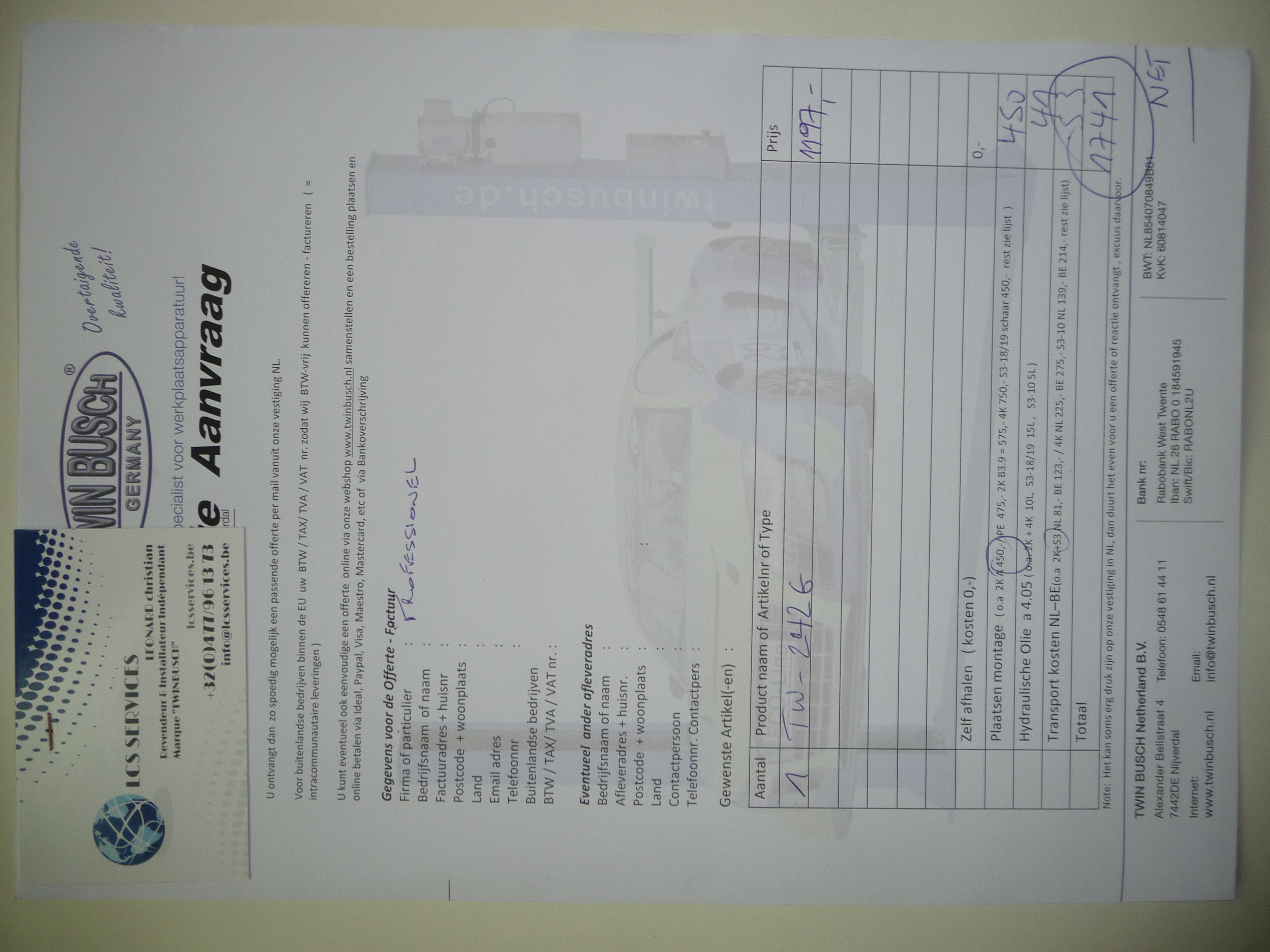 L'offre concernait un 2 colonnes compact, modèle TW-242G (le modèle 4.2 T qui ne mesure que 2.32 de haut et 2.98 de large hors-tout (peut en principe être installé dans un box pas trop petit).